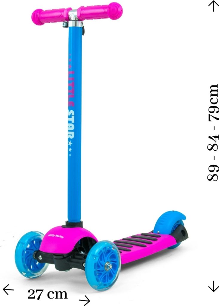 Super stylová dětská koloběžka Milly Mally Little Star. Není to jen koloběžka, je to také odrážedlo pro děti od druhých narozenin, které má sedadlo i vodíci tyč pro rodiče. Nosnost do 20 kg. Sedadlo i vodíci tyč lze jednoduše sundat a z odrážedla se rázem stane koloběžka s nosností do 50 kg. Je ideálním řešením pro aktivní děti, které jsou v neustálém pohybu. Little Star je vyrobena z kvalitních materiálů, ideální na procházky i pro skvělou zábavu. Kovová konstrukce zaručuje odolnost výrobku. Koloběžka má navíc brzdu a blatník na zadním kolečku. Řízení a kroucení pracuje na principu rovnováhy těla. Velkou výhodou koloběžky jsou 3 kola, které poskytnou stabilitu a bezpečnost. Děti potěší také, svítíci přední kola během jízdy. Little Star je 3v1, pohodlí a jednoduchost v moderní formě. Charakteristika: - koloběžka-odrážedlo - určeno pro děti od 2 let - nosnost: cca 20 kg - koloběžka - určeno pro děti od 5 let - nosnost: cca 50 kg - bytelná kovová konstrukce rámu - ovládací rukojeť pro rodiče - brzda a blatník na zadním kole - pohodlné kryty na řídítkách - výškově nastavitelná rukojeť-3 stupně - pohodlné měkké tvarované sedadlo - protiskluzová platforma - rozměry: - výška cca 79-100 cm - šířka cca 27 cm - délka cca 57 cm - hmotnost: 4,1 kg - průměr zadních koleček cca 10 cm - průměr předního kolečka cca 12 cm