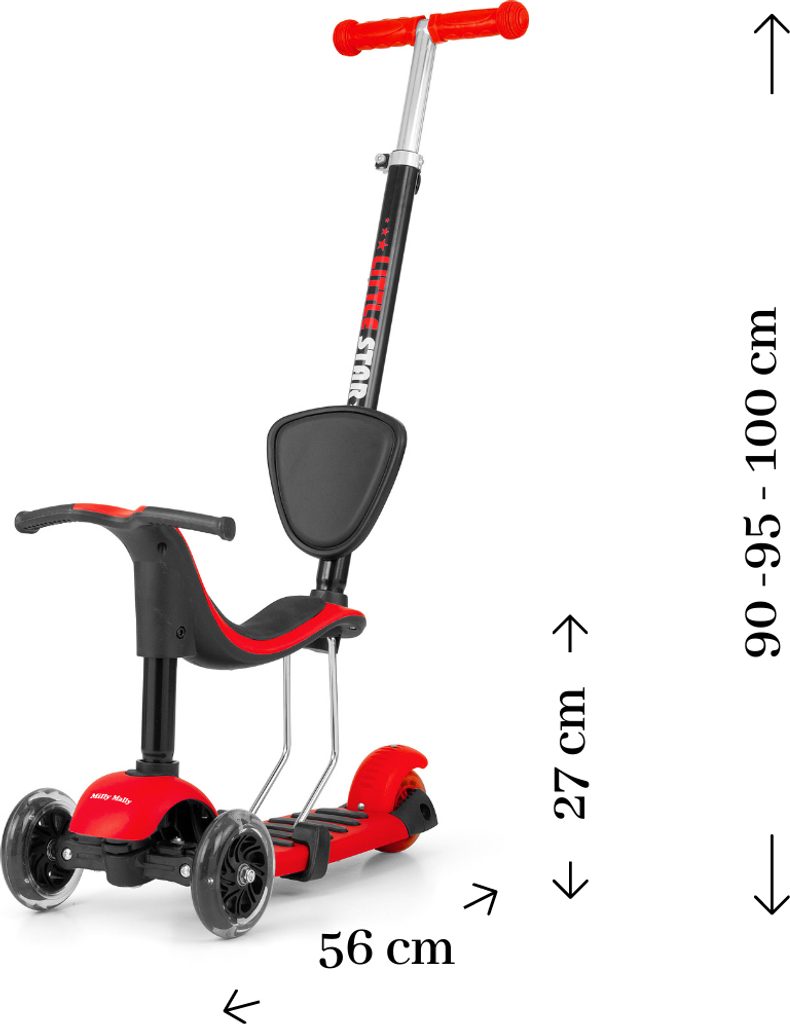 Super stylová dětská koloběžka Milly Mally Little Star. Není to jen koloběžka, je to také odrážedlo pro děti od druhých narozenin, které má sedadlo i vodíci tyč pro rodiče. Nosnost do 20 kg. Sedadlo i vodíci tyč lze jednoduše sundat a z odrážedla se rázem stane koloběžka s nosností do 50 kg. Je ideálním řešením pro aktivní děti, které jsou v neustálém pohybu. Little Star je vyrobena z kvalitních materiálů, ideální na procházky i pro skvělou zábavu. Kovová konstrukce zaručuje odolnost výrobku. Koloběžka má navíc brzdu a blatník na zadním kolečku. Řízení a kroucení pracuje na principu rovnováhy těla. Velkou výhodou koloběžky jsou 3 kola, které poskytnou stabilitu a bezpečnost. Děti potěší také, svítíci přední kola během jízdy. Little Star je 3v1, pohodlí a jednoduchost v moderní formě.
