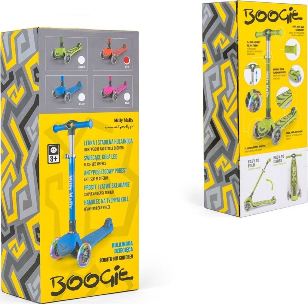 Abychom vyhověli potřebám našich malých závodníků, vytvořili jsme koloběžku BOOGIE SCOOTER. Je ideálním řešením pro aktivní děti, které mají rády pohyb. BOOGIE je vyroben z kvalitních materiálů, je ideální na procházky nebo řádění kolem domu. Lehká a přitom pevná hliníková konstrukce zaručí odolnost a dlouhou životnost výrobku. Řízení a zatáčení funguje na principu změny rovnováhy těla. Velkou výhodou koloběžky jsou 3 kola, která poskytnou stabilitu a bezpečnost. Zadní kolečko je navíc dvojité. Barevná a svítící přední kola zaručí dětem během jízdy ještě větší zábavu.