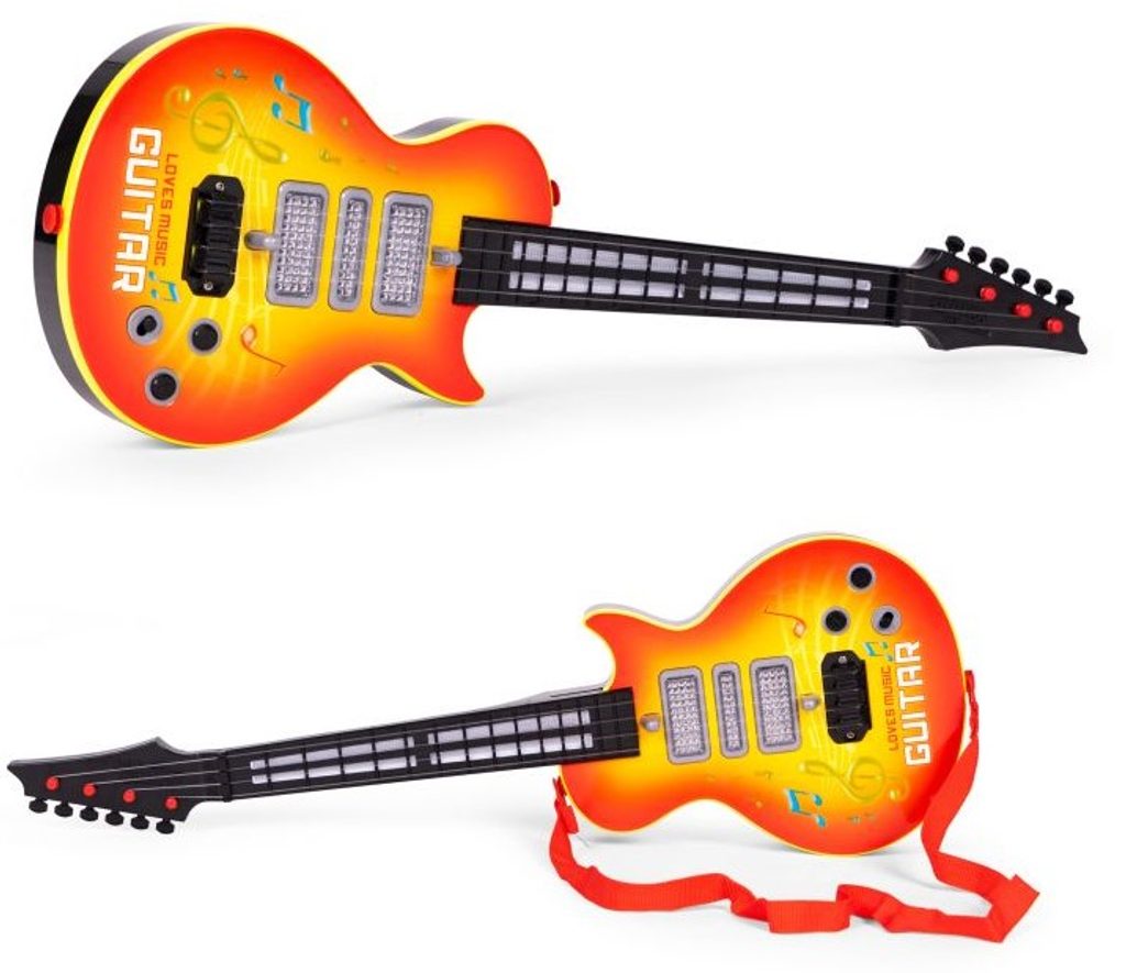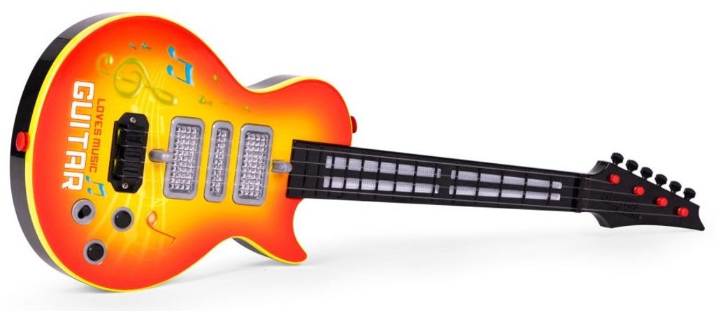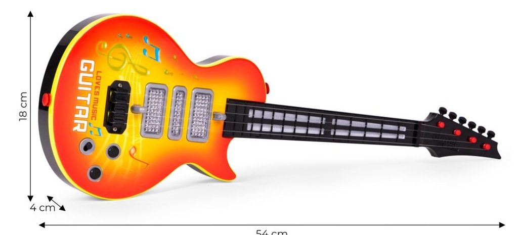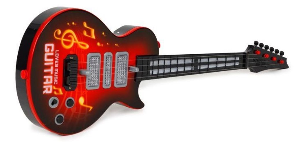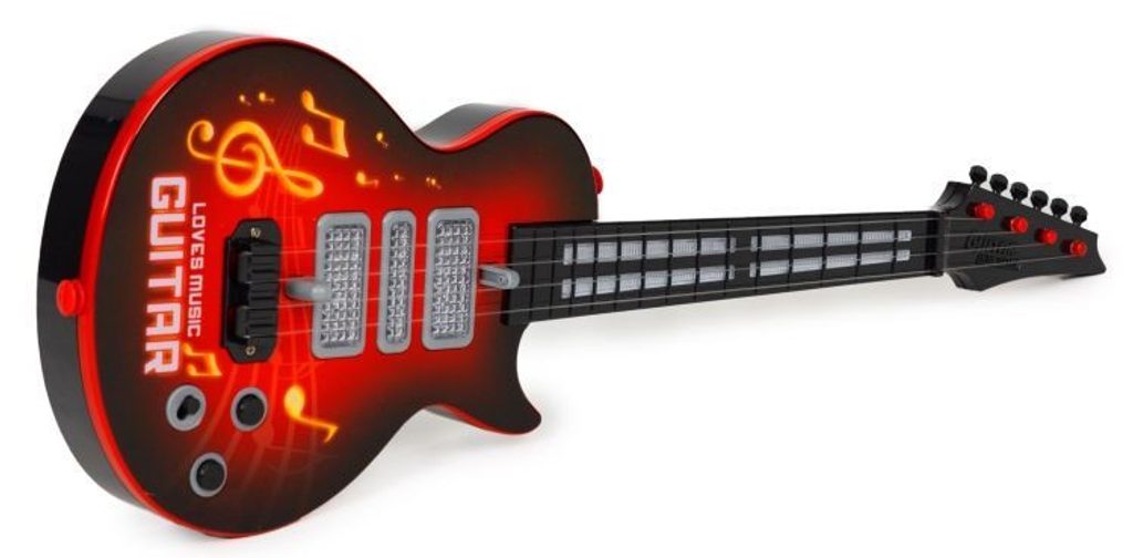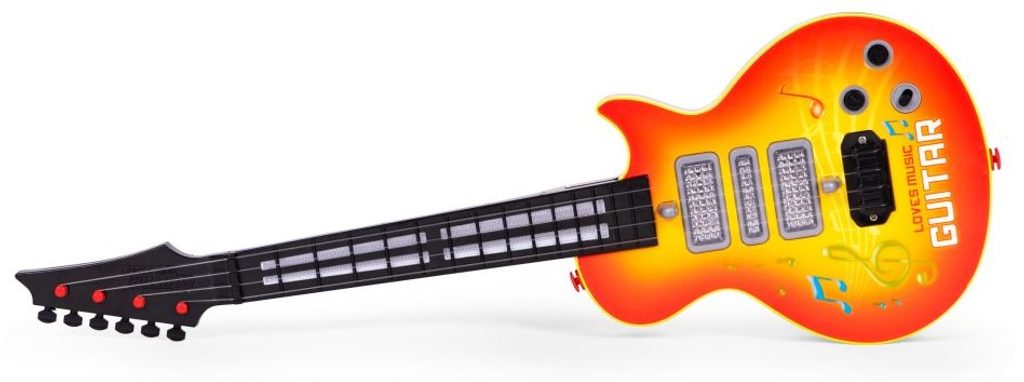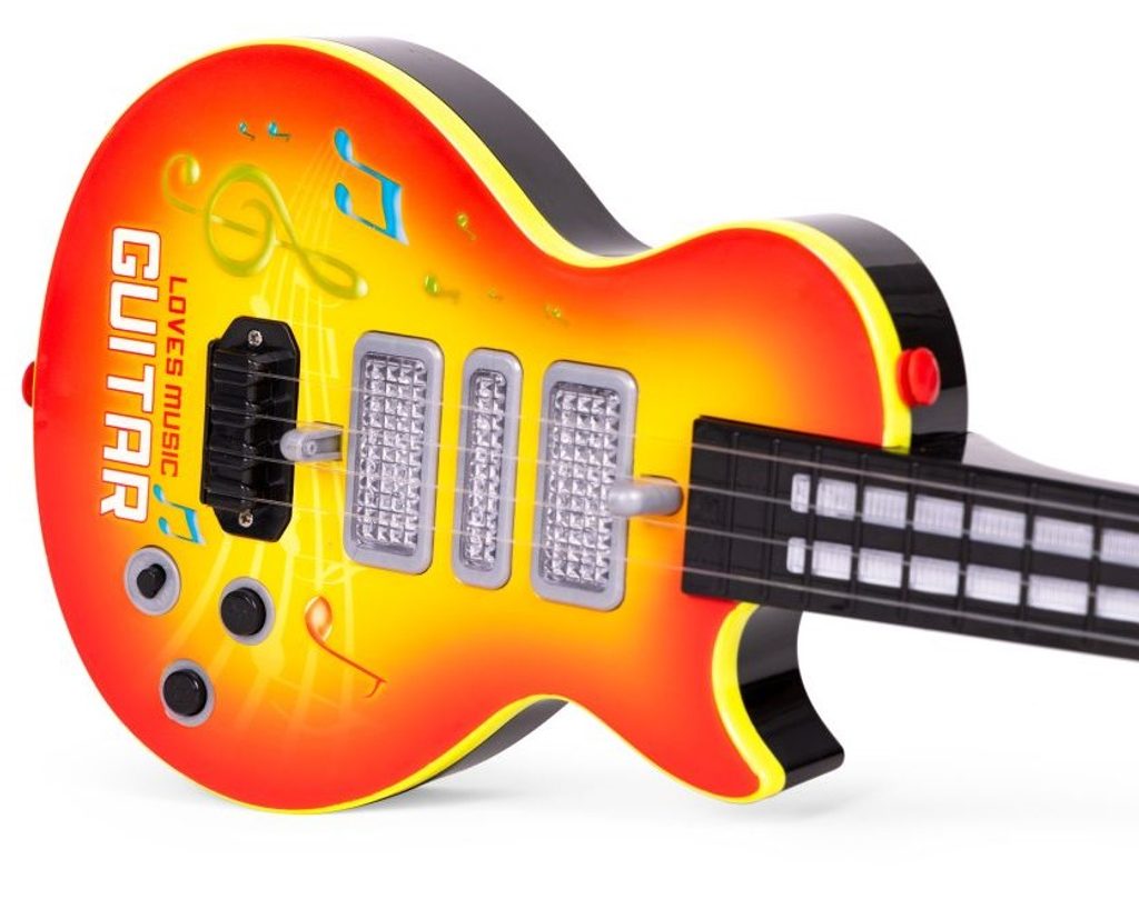 Dětská kytara pro nejmenší Rock Guitar je reálnou kopií kytary pro dospělé a je ideální hračkou pro nauku hry na tento hudební nástroj. Má 4 kovové struny, na krku kytary jsou potom 4 napínáky strun. Ve výbavě jsou také zvukové efekty a LED podsvícení. Je vyrobena z plastu a kovu v pestrobarevném provedení. Hračka je určena pro děti od 36 měsíců věku.