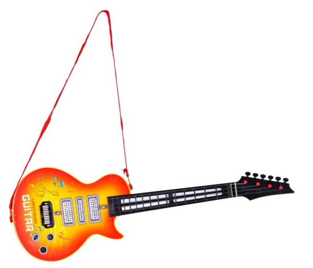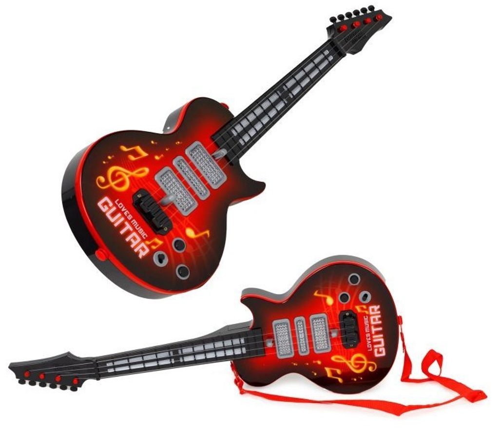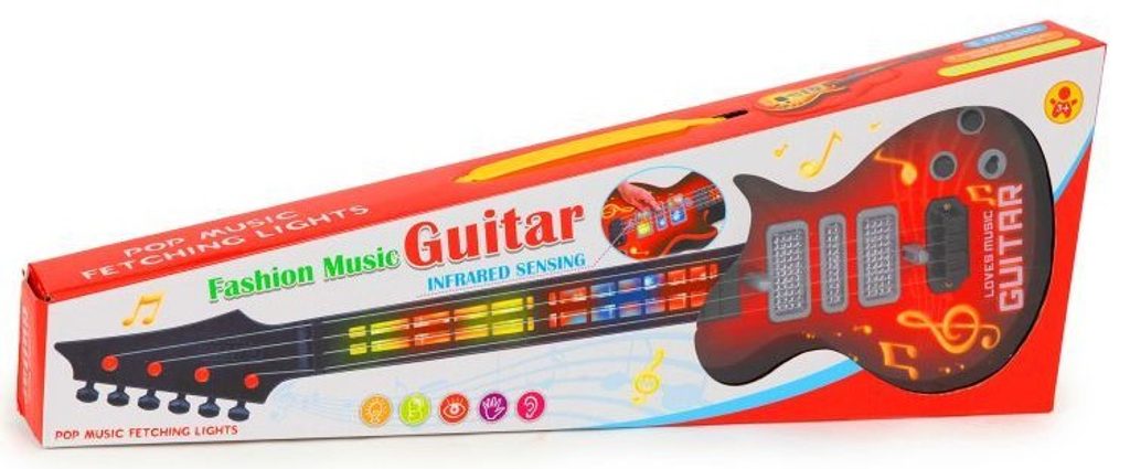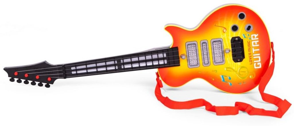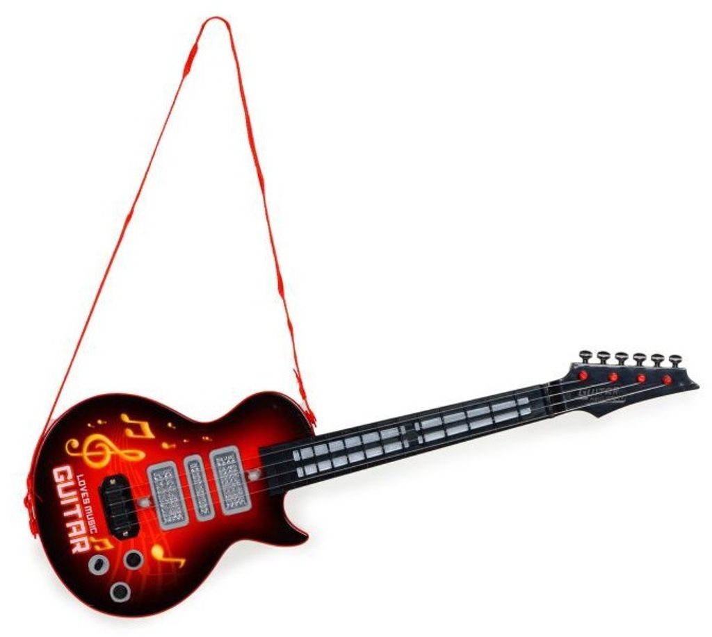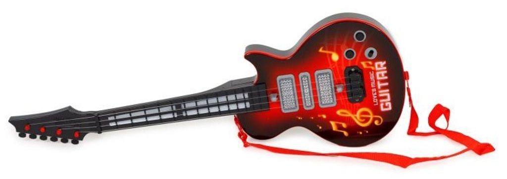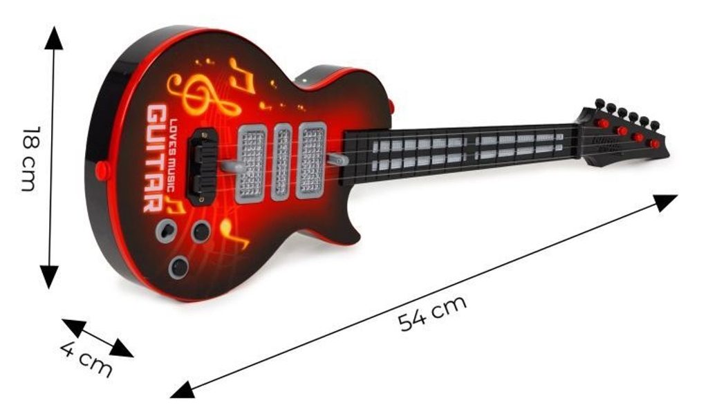 Dětská kytara pro nejmenší Rock Guitar je reálnou kopií kytary pro dospělé a je ideální hračkou pro nauku hry na tento hudební nástroj. Má 4 kovové struny, na krku kytary jsou potom 4 napínáky strun. Ve výbavě jsou také zvukové efekty a LED podsvícení. Je vyrobena z plastu a kovu v pestrobarevném provedení. Hračka je určena pro děti od 36 měsíců věku.