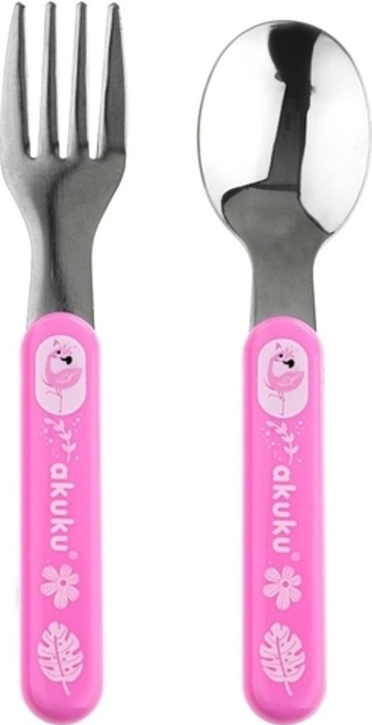 Sada dětských nerezových příborů Akuku, která je ideální pro bezpečné a pohodlné krmení dítěte jak doma, tak i během cestování. Všechny části mají bezpečné kulaté tvary přizpůsobené citlivým dětským dásním. Vyrobeno z vysoce kvalitní nerezové oceli, z bezpečných materiálů určených pro styk s potravinami. Sada obsahuje lžičku a vidličku.