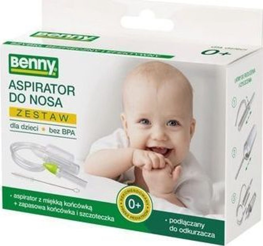 Benny Nasal odsávačka na rýmu Vlastnosti produktu -Neobsahuje zdraví škodlivé látky jako BPA -Dvě vyměnitelné flexibilní hroty -Čisticí kartáč -Lékařská složka -Pohodlné a bezpečné použití -Odolný vůči vysokým teplotám -Snadno se rozkládá a skládá -Není potřeba používat další filtry -Přípravek lze použít u dětí všech věkových kategorií -Vyrobeno v EU