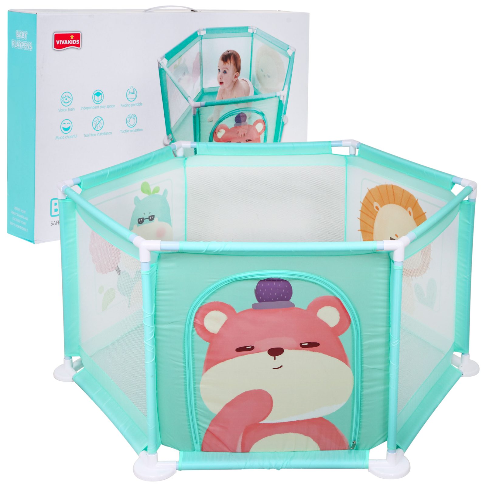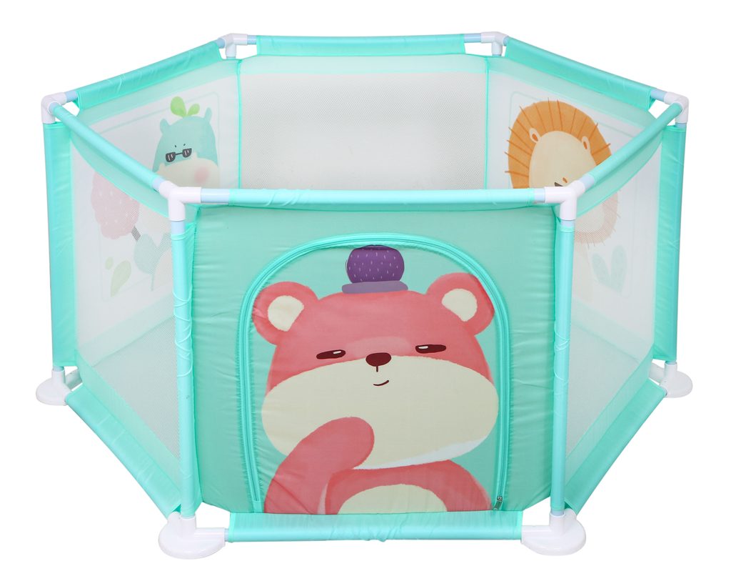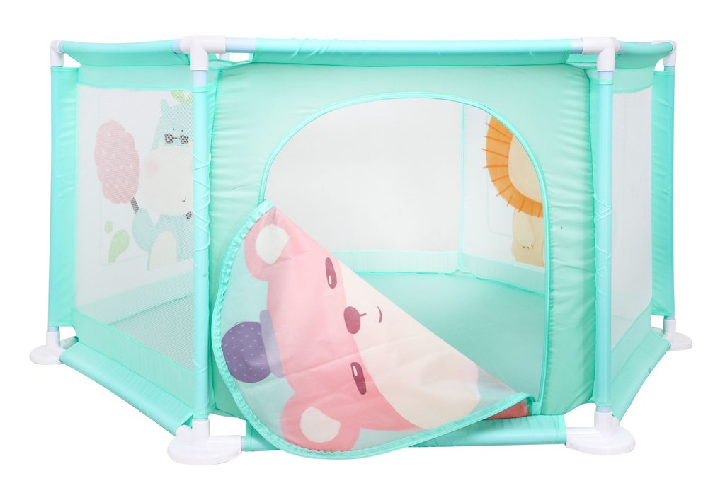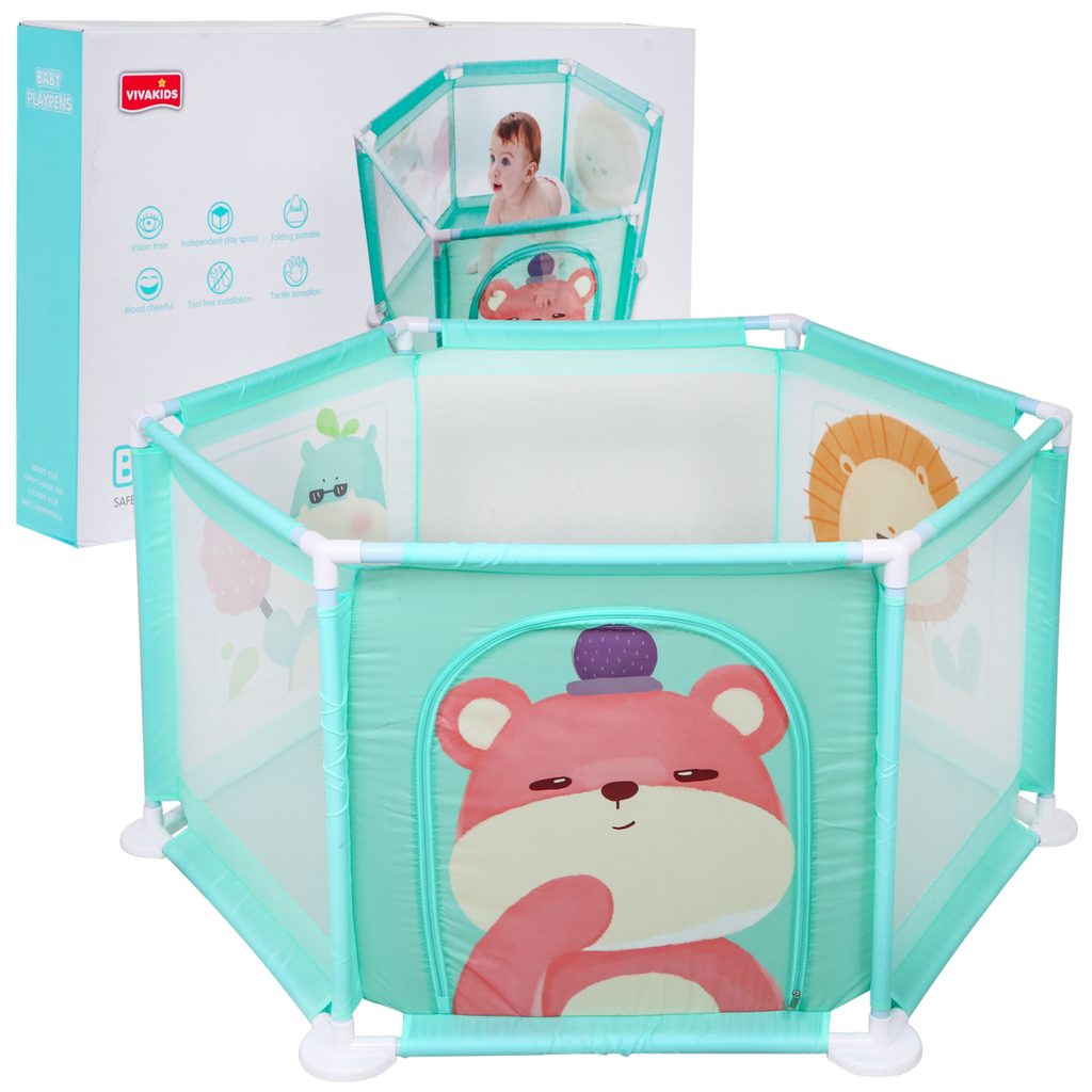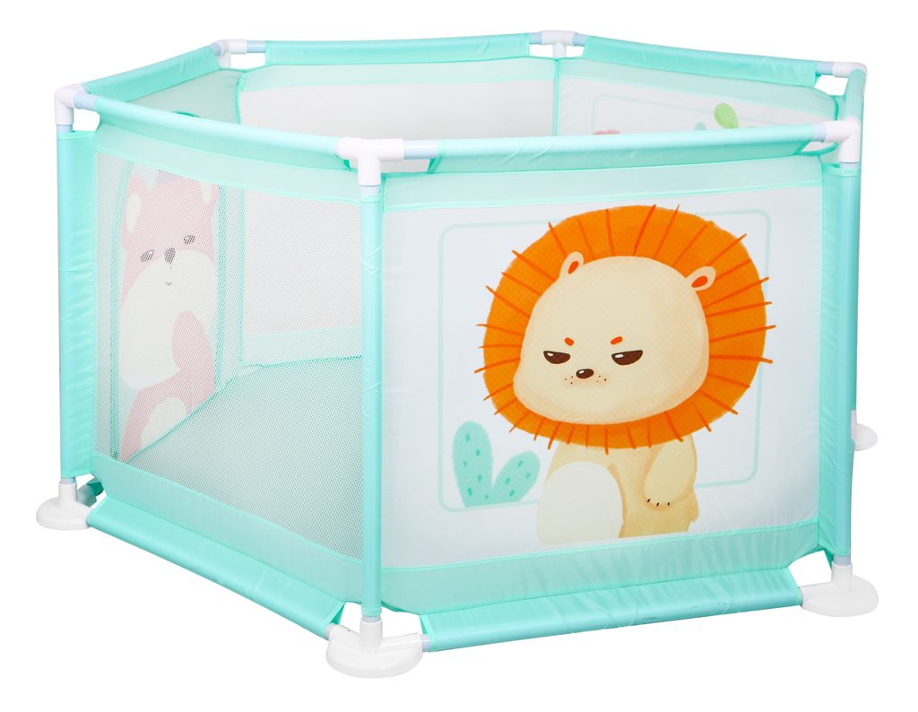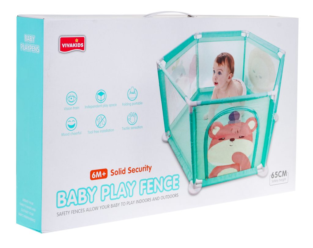 Bezpečná ohrádka Baby Fence je určenapro miminka od 6 měsíců. Poskytuje prostor pro pohyb bez rizika zranění či pádu. Je vyrobená z bezpečných materiálů bez ostrých či malých prvků, snadno čistitelná. Stabilní rám zajišťuje pevnost a odolnost. Pohodlně přenositelná z místnosti do místnosti nebo ven na zahradu, aby dítě bylo v bezpečí i během každodenních aktivit rodičů. Ohrádka má tři stěny vyrobené ze síťoviny, umožňující pozorování miminka při hře. Jedna stěna je vybavena zipem pro snadný vstup a výstup. Na třech stěnách jsou velké obrázky: medvídek, lev a hroch.