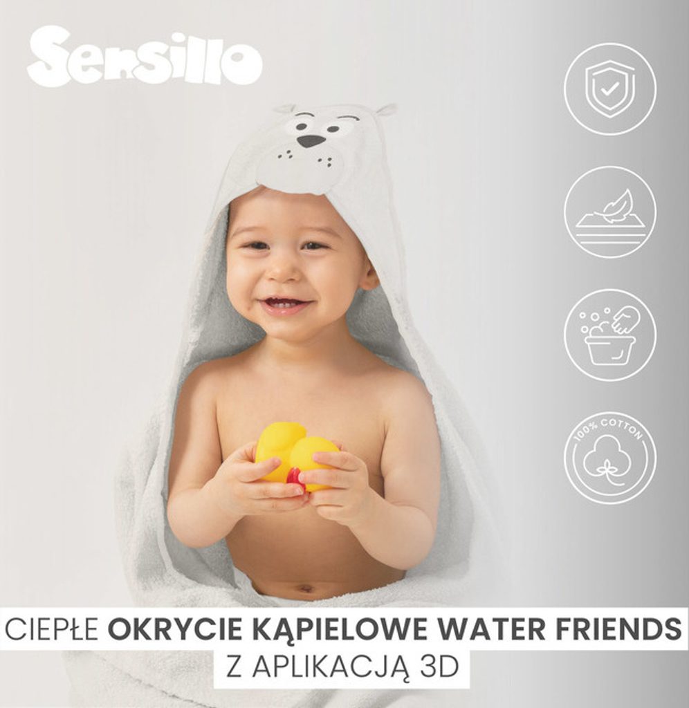 S novými osuškami Water Friends je koupání čistá radost. Děti a jejich rodičů. Sensillo osuška Water Friends je vyrobená ze 100% bavlněné froté látky, je savá a rychle schnoucí. Rodiče také ocení její pečlivé, nedráždivé šití. Kapuci zdobí legrační obličej vodního zvířátka, které je pro každou barvu jiný. K dispozici v rozměru 100x100cm.