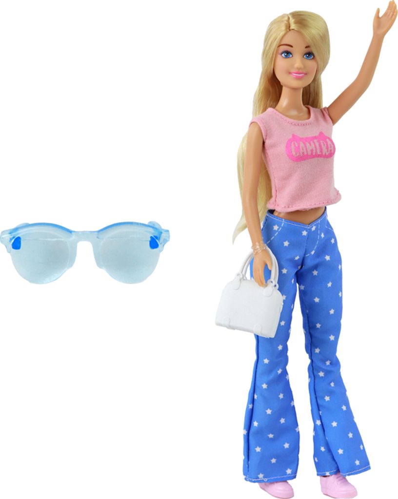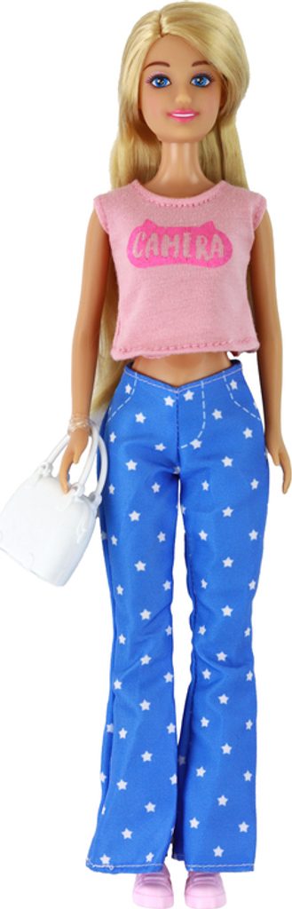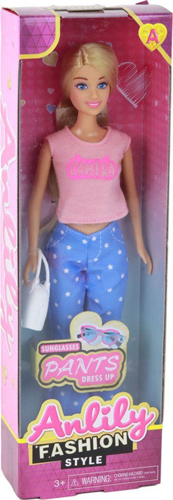 Panenka Anlily s dlouhými blond vlasy, kabelkou a brýlemi. Oblečená do módní halenky a kalhot. Rozměry 30 cm x 7 cm x 5 cm. Vytvářejte stylové příběhy s Anlily!