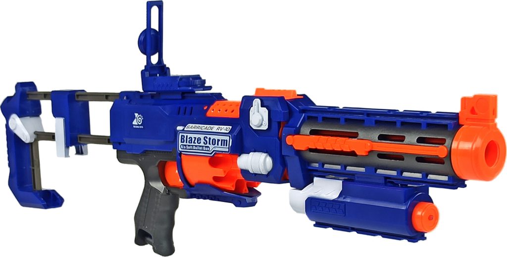 Tato pistole je výkonný kus hračky. Jeho konstrukce je masivní, takže jej lze držet mnoha různými způsoby. Zbraň je vybavena dvěma lištami umožňujícími instalaci dalšího příslušenství. Jeden z nich je umístěn pod barelem, díky kterému můžete nainstalovat rukojeť, která vám umožní pevněji uchopit hračku, a je také vybavena červeným světlem. Zadní část tvoří odnímatelná pažba, která umožňuje opřít si pušku o rameno, přičemž v horní části je lišta s namontovaným mířidlem. Zásobník zbraně má bicí mechanismus s otevřenými komorami, takže jej lze průběžně dobíjet. Nad zásobníkem je posuvné okénko, díky kterému můžete nahlédnout do nábojové komory, abyste jej v případě zaseknutí snadno vyjmuli. Ve spodní části rukojeti zbraně je háček, ke kterému lze připevnit karabiny pro pohodlnější nošení zbraně. Po sejmutí hledí, přídavné rukojeti a pažby lze pušku stále používat, stává se lehčí a šikovnější.