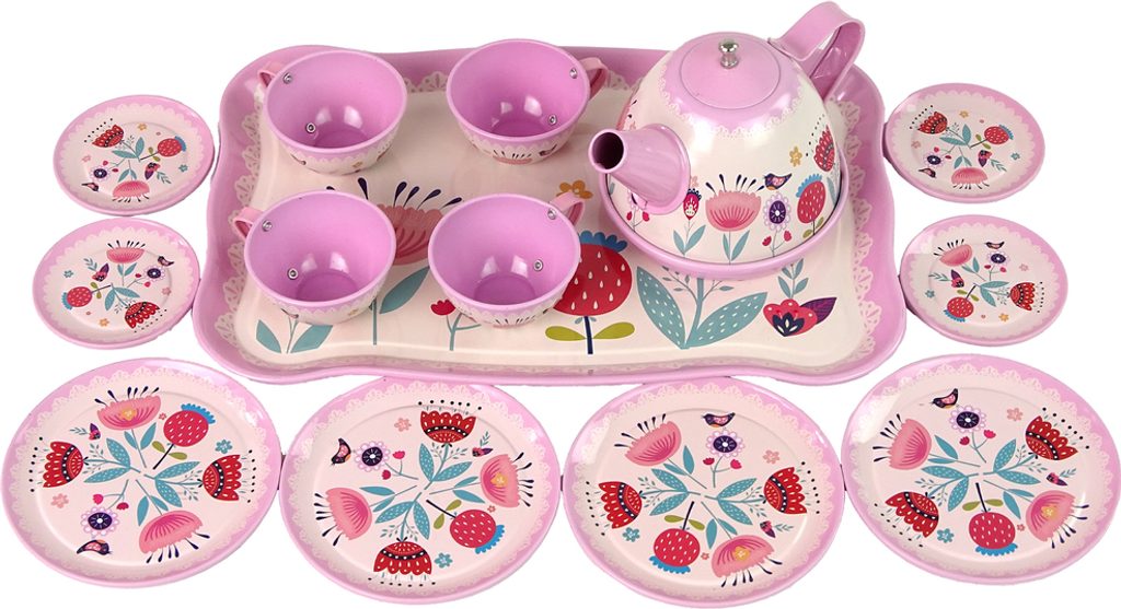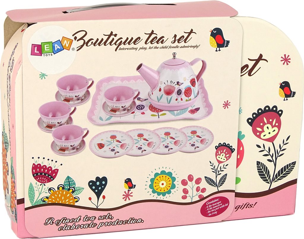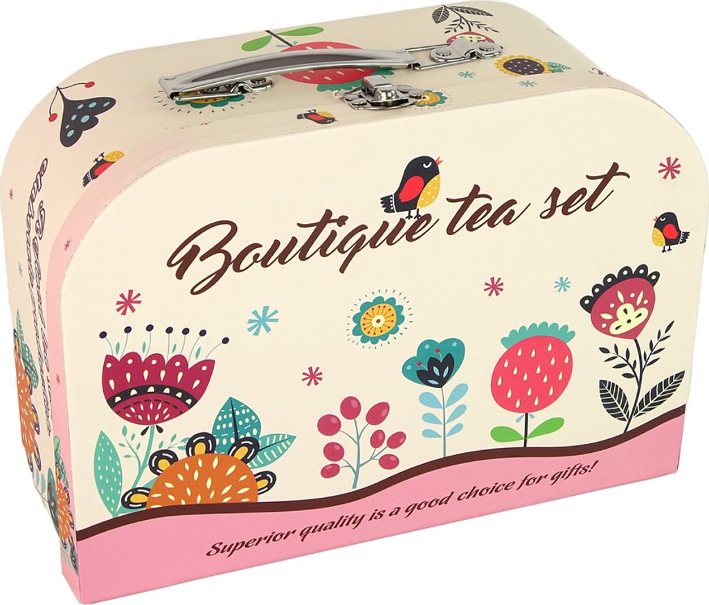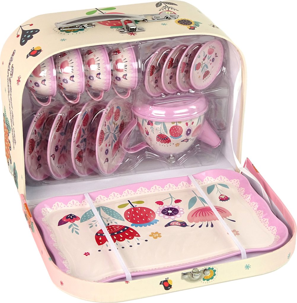 Uvnitř kufru je sada na kávu a čaj, která se skládá z malých a velkých talířů, varné konvice, šálků a tácu. Všechny prvky soupravy jsou v okouzlujících růžových barvách a mají zajímavé vzory, které přitahují pozornost.