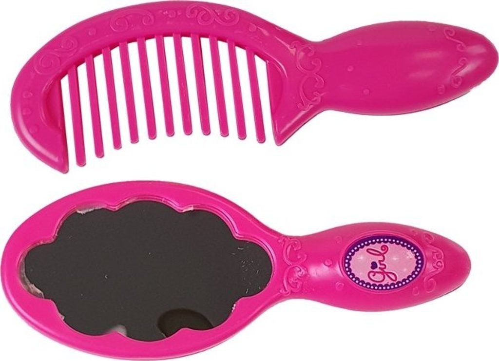 - fén - difuzér na fén - žehlička - 2 prstýnky - zrcátko - hřeben - 2 sponky do vlasů - malá růžová krabička se zrcátkem