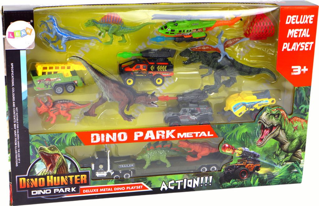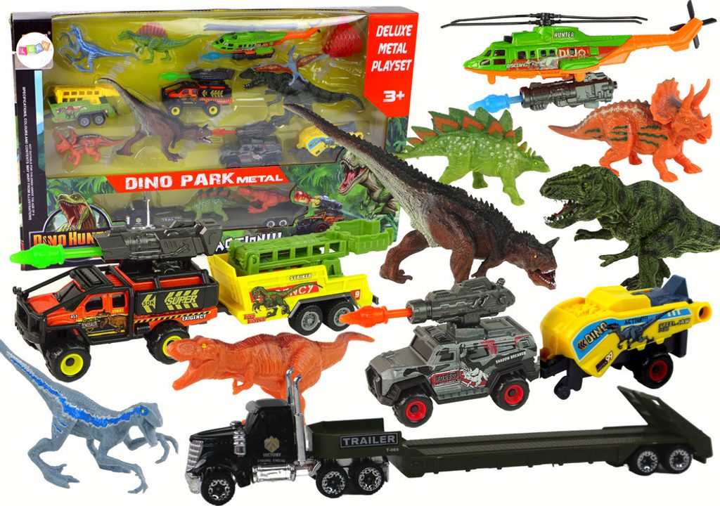 Sada obsahuje tři realistická vozidla s přívěsy, vrtulník, osm různých dinosaurů a síť. Je vyrobena z gumy a plastu. Poskytuje spoustu příležitostí ke hře, rozvíjí dětskou fantazii a kreativitu.