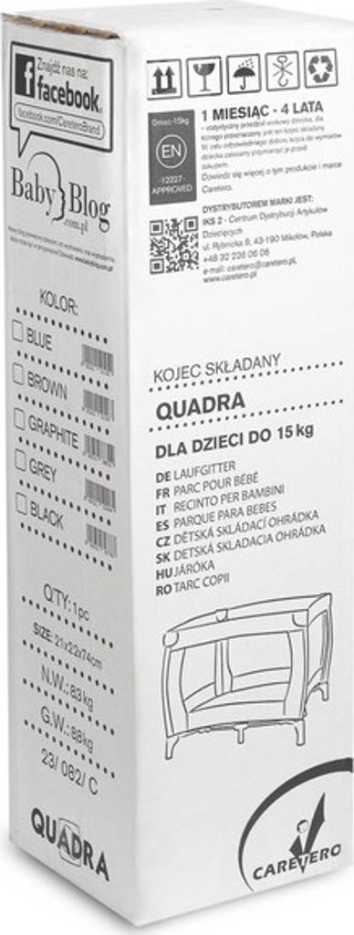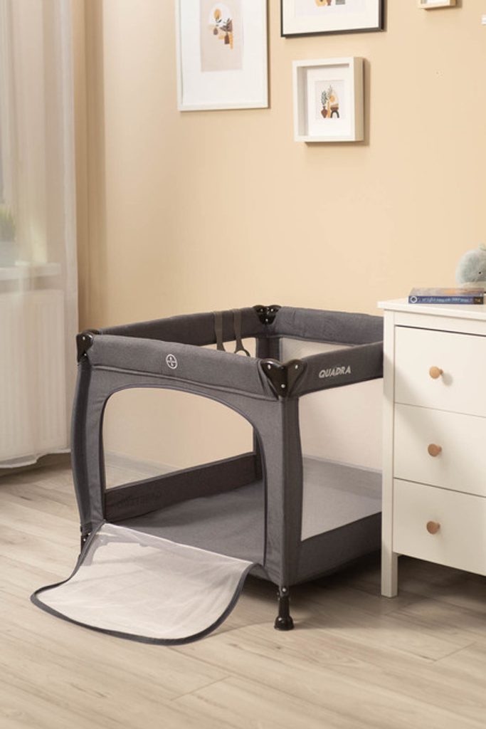 Quadra je lehká a praktická hranatá ohrádka. Vyrobeno z tkaniny a vysoce kvalitního plastu, díky čemuž je odolná. Vybaveno podložkou, dvířky se zámkem a madly pro naučení vstávání. Quadra je perfektní místo pro hraní a odpočinek doma i na cestách. Snadné skládání a šikovná taška vám usnadní přepravu ohrádky.