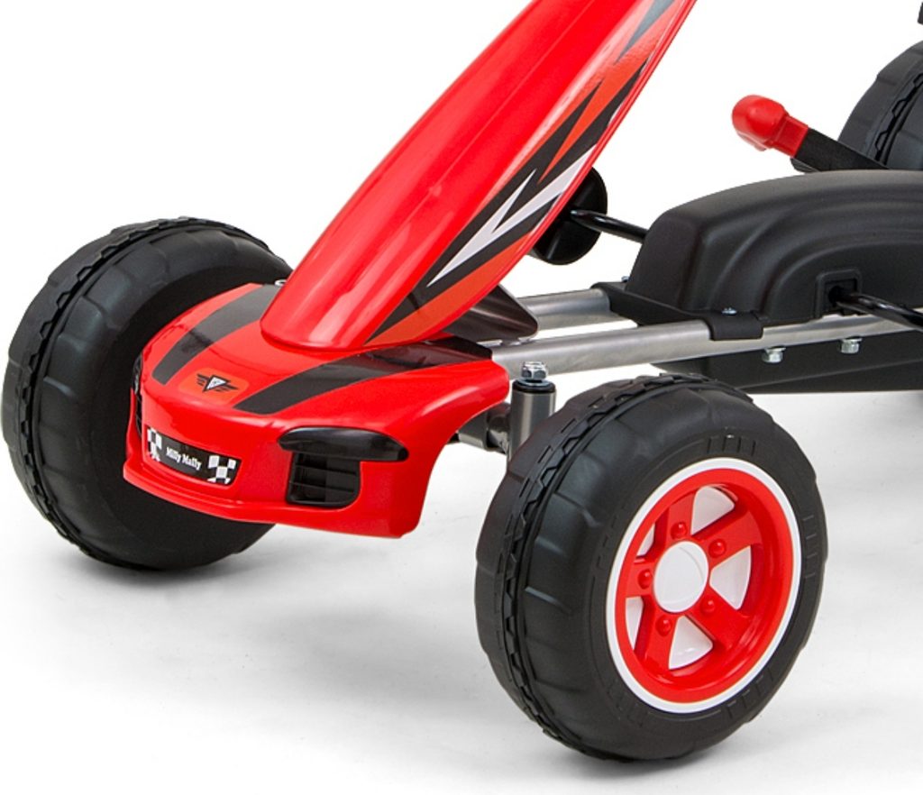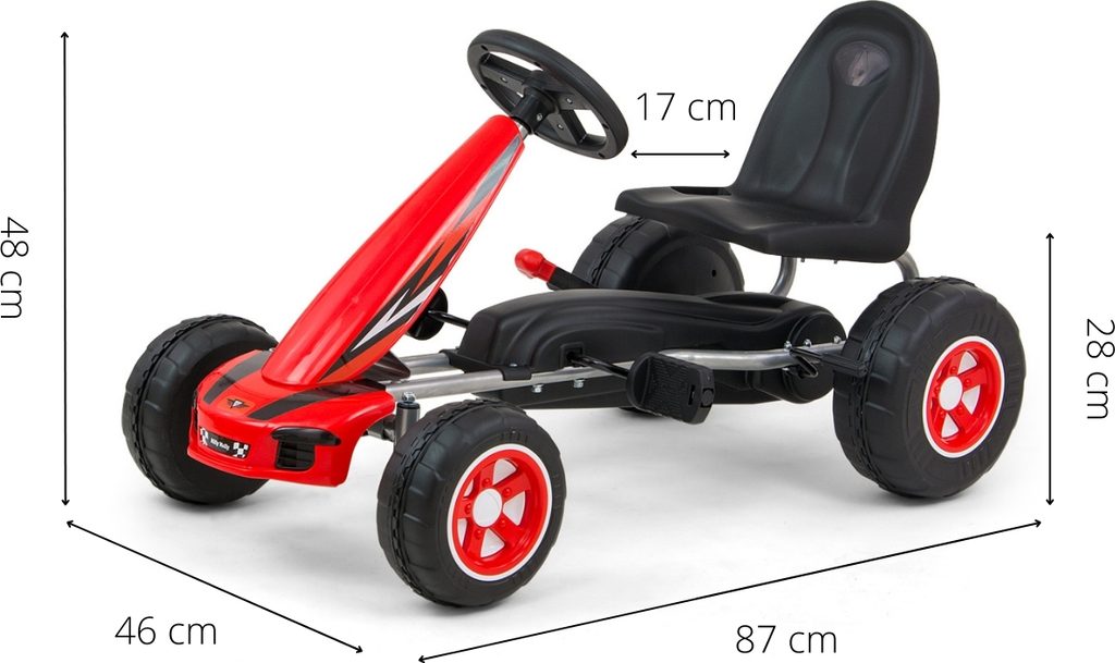 CHARAKTERISTIKA: - sportovní ergonomický a moderní design - možnost jízdy vpřed a vzad pomocí pedálu - pohodlné a elegantní sedadlo s opěradlem - tvarované sedadlo s regulací vzdálenosti od volantu o 2 stupně - sportovní tříramenný volant - realistický vzhled - ruční brzda - vyrobená z bezpečných materiálů - pohodlná jízda díky plastovým kolům s barevnými ráfky - maximální zatížení - 30 kg - průměr předních kol - 18,5 cm - průměr zadních kol - 22 cm - certifikát bezpečnosti CE - k dispozici ve 4 barvách - věková kategorie 3+