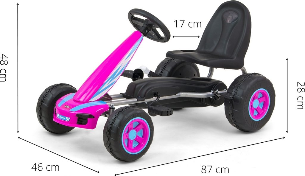 Šlapací motokára Viper má lehkou kovovou konstrukci a díky velkým plastovým kolům umožňuje pohodlnou jízdu i na nerovném povrchu. Pevný rám je navíc opatřen dodatečnou výztuží. Ruční brzda zajišťuje bezpečné zastavení. Vzdálenost sportovně tvarovaného sedadla lze nastavit od volantu ve dvou stupních. Díky možnosti nastavení sedadla od volantu motokára "poroste" s vaším dítětem.