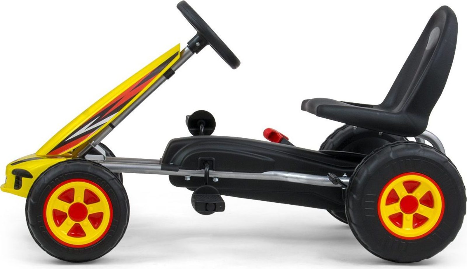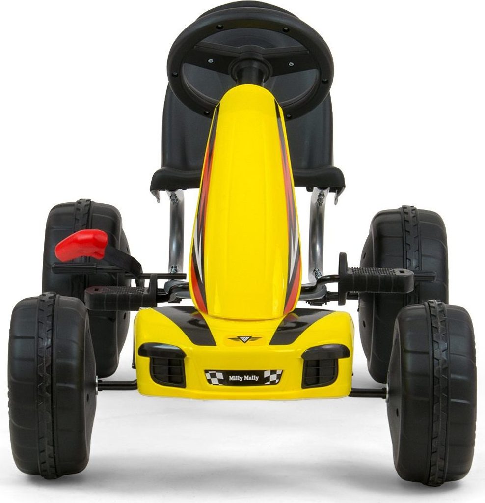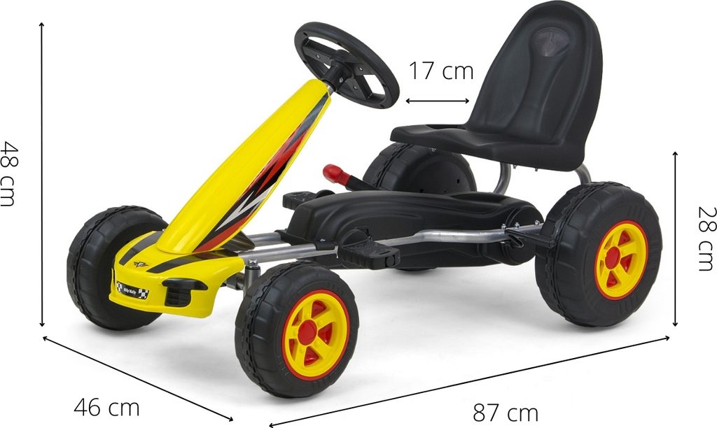 CHARAKTERISTIKA: - sportovní ergonomický a moderní design - možnost jízdy vpřed a vzad pomocí pedálu - pohodlné a elegantní sedadlo s opěradlem - tvarované sedadlo s regulací vzdálenosti od volantu o 2 stupně - sportovní tříramenný volant - realistický vzhled - ruční brzda - vyrobená z bezpečných materiálů - pohodlná jízda díky plastovým kolům s barevnými ráfky - maximální zatížení - 30 kg - průměr předních kol - 18,5 cm - průměr zadních kol - 22 cm - certifikát bezpečnosti CE - k dispozici ve 4 barvách - věková kategorie 3+