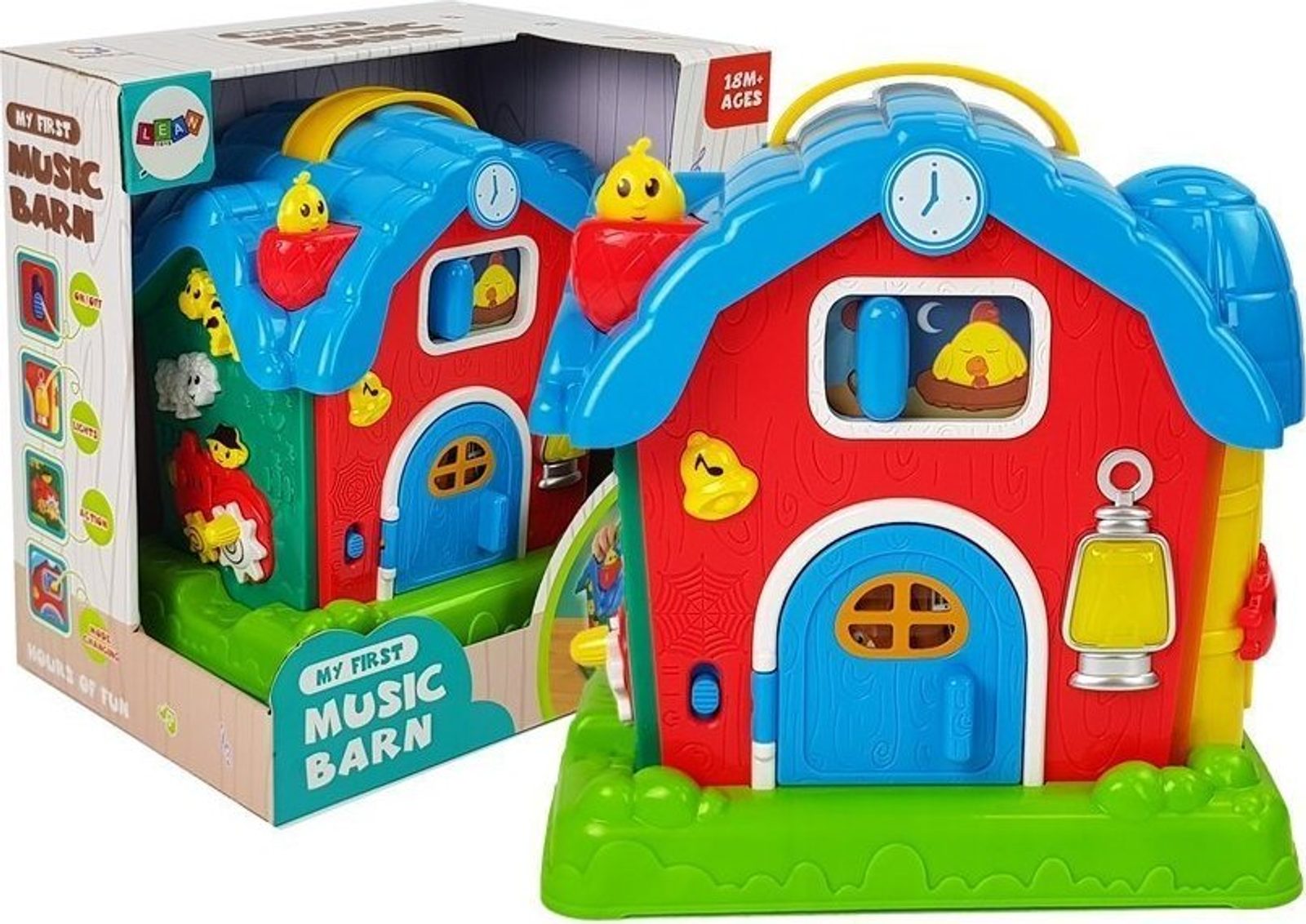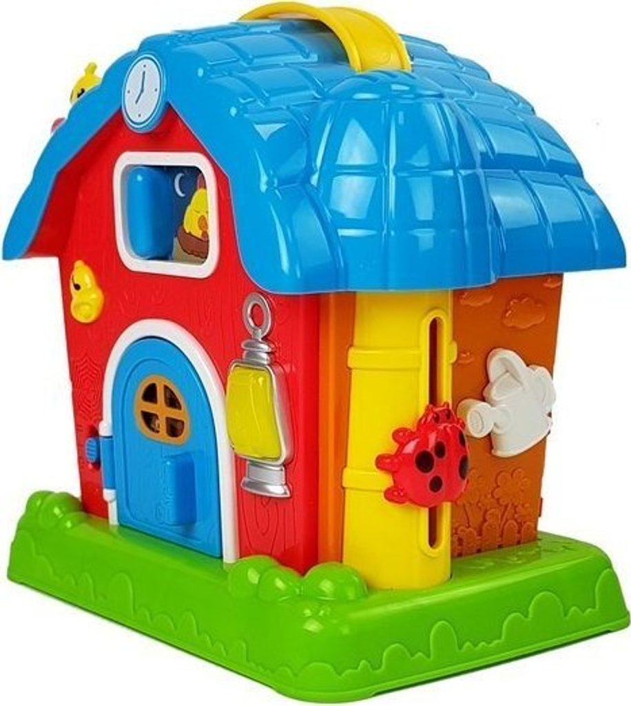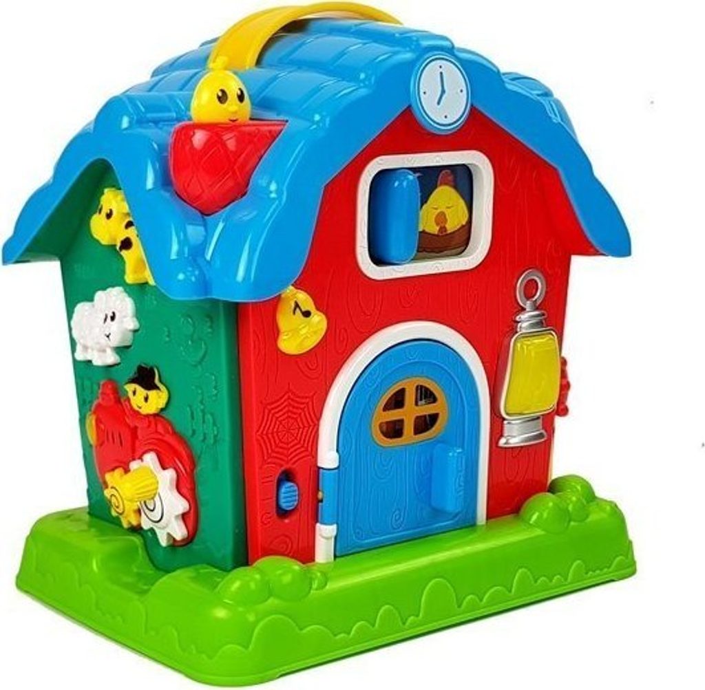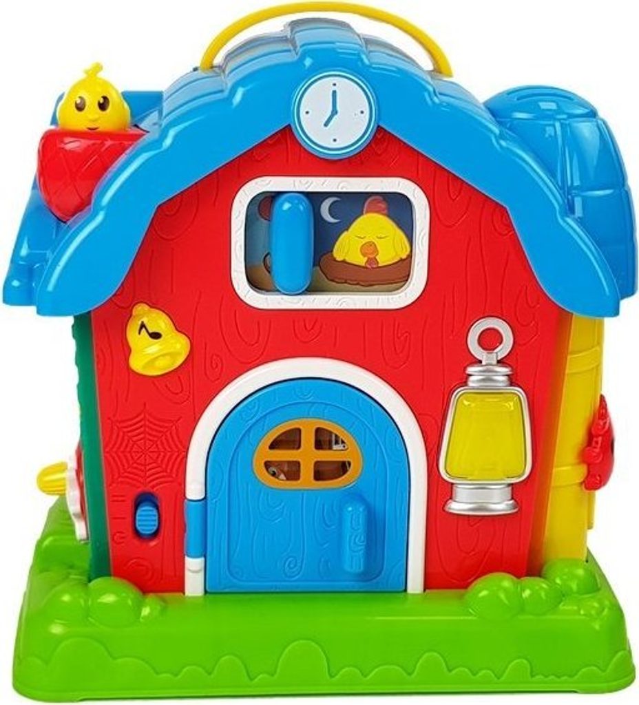 Hračka se skládá z mnoha druhů. Všechny zvuky a jména jsou namluveny v angličtině, takže se vaše ratolest naučí základní slovíčka v jiném jazyce. Všechny vyčnívající prvky trénují úchop a přesnost vašeho dítěte. Když otevřete dveře, stisknete zvonek, ovečku nebo krávu, uslyšíte zvuky, které vydávají. Nahoře na stříšce, v komíně, je malé miminko, které po stisknutí vypráví příběh. Součástí hračky je i slepice, která ožívá a pomáhá s usínáním. Vše je doprovázeno světelnými efekty v podobě lampy v přední části budovy.