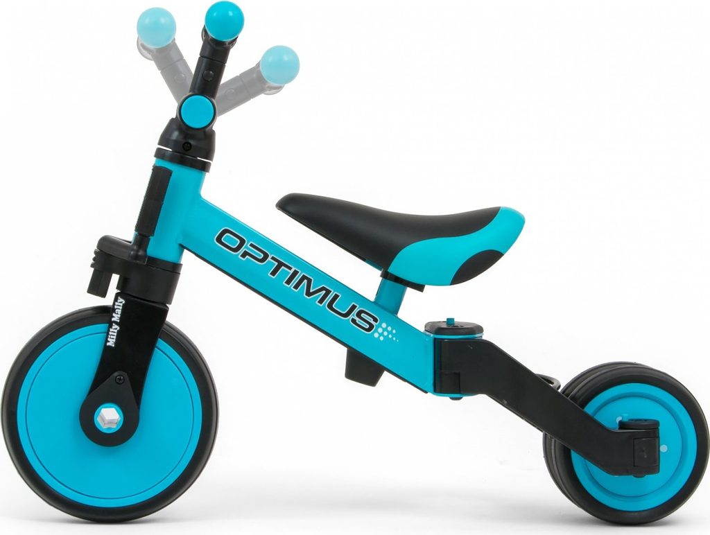 Univerzální dětská šlapací tříkolka Milly Mally 3v1 Optimus byla navržena tak, aby se stala tím nejlepším co můžete nabídnout svému malému závodníkovi. Díky stabilní konstrukci poskytuje dítěti maximální úroveň bezpečnosti a tímto mu usnadňuje získávání nových dovedností. Největší výhodou této tříkolky je její variabilita. Jakmile dítě získá základy jízdy, připojíme pedály nebo jí během okamžiku změníme na klasické jednostopé odrážedlo. Pěnová kola výborně absorbují rázy, poskytují dobrou přilnavost, zajistí pohodlí během jízdy a neunaví vašeho malého závodníka. Dostatečný rozvor kol poskytuje mimořádnou stabilitu, bezpečnost během používání doma i venku. Doraz nedovolí přetočení řídítek.