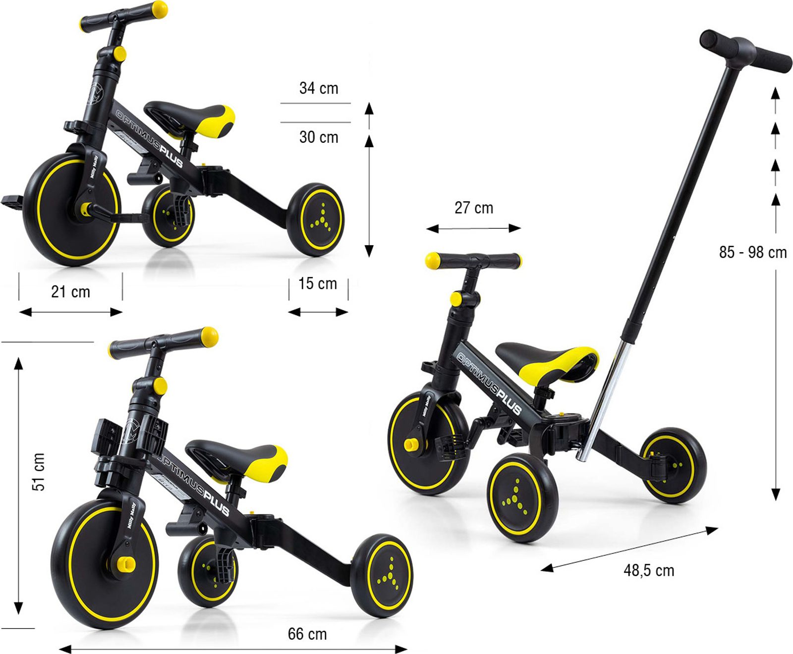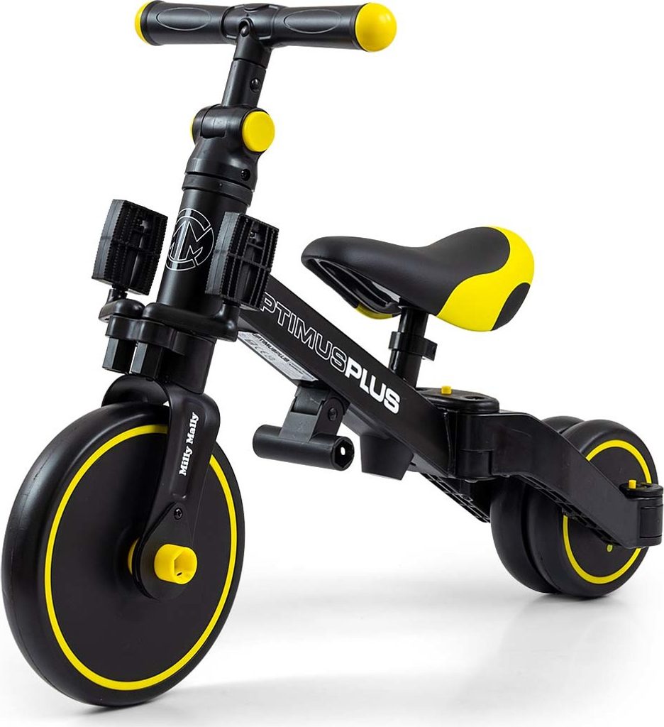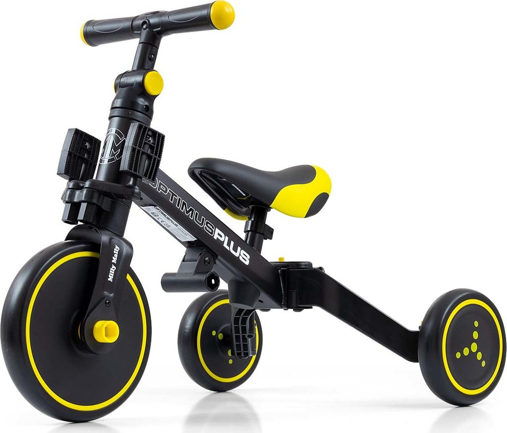 Univerzální dětská šlapací tříkolka Milly Mally 4v1 Optimus byla navržena tak, aby se stala tím nejlepším co můžete nabídnout svému malému závodníkovi. Díky stabilní konstrukci poskytuje dítěti maximální úroveň bezpečnosti a tímto mu usnadňuje získávání nových dovedností. Největší výhodou této tříkolky je její variabilita. Jakmile dítě získá základy jízdy, připojíme pedály nebo jí během okamžiku změníme na klasické jednostopé odrážedlo. Pěnová kola výborně absorbují rázy, poskytují dobrou přilnavost, zajistí pohodlí během jízdy a neunaví vašeho malého závodníka. Dostatečný rozvor kol poskytuje mimořádnou stabilitu, bezpečnost během používání doma i venku. Doraz nedovolí přetočení řídítek.
