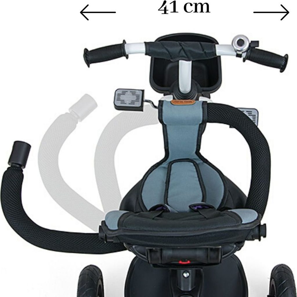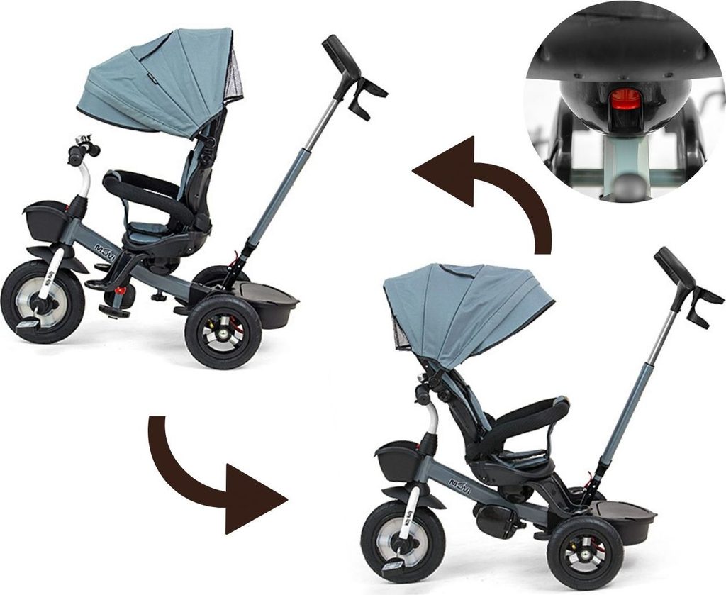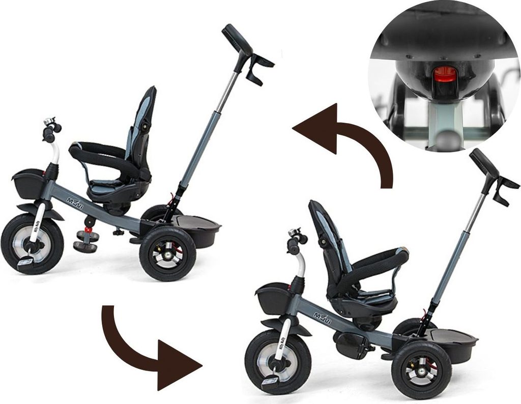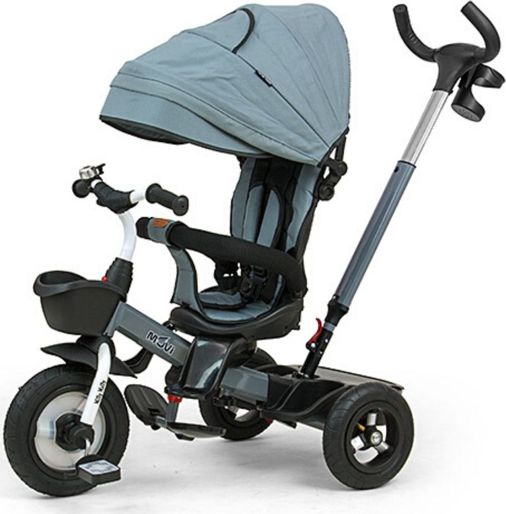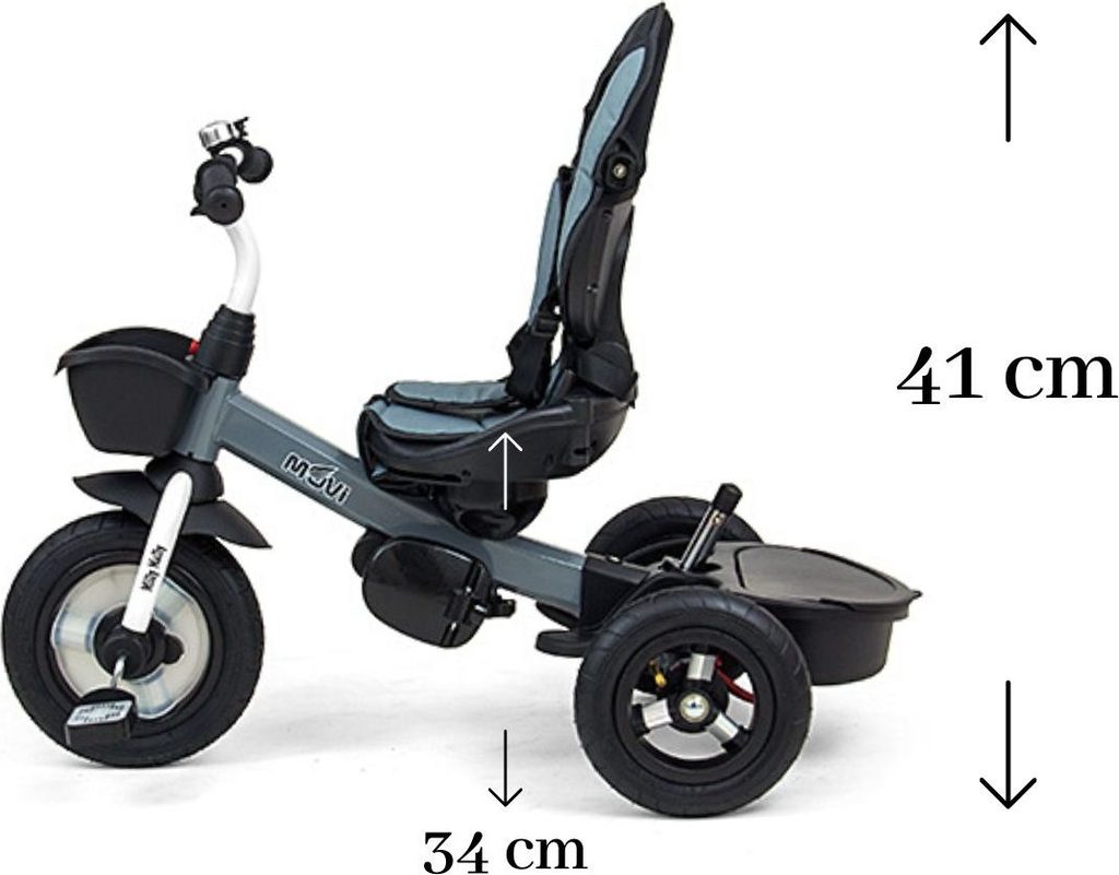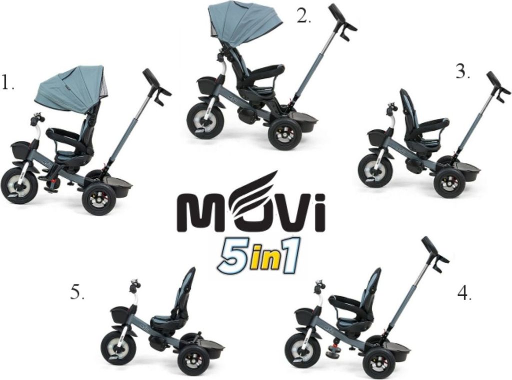 Dětská šlapací tříkolka Milly Mally Movi je typickým příkladem produktů GROW UP - roste zároveň s dítětem. Je vyrobena z kvalitních a odolných materiálů. Má moderní konstrukci, pohodlné a ergonomicky tvarované sedadlo, které je otočné o 360 stupňů, což umožní dítěti cestovat ve směru nebo proti směru jízdy. O pohodlí a bezpečí během jízdy se stará bariérka, tříbodové bezpečnostní pásy, pohodlné stupačky nebo velká nafukovací kola, které skvěle absorbují rázy a poskytují dobrou přilnavost. Tříkolku může ovládat jak dítě, tak i rodič pomocí nastavitelné rukojeti pro tlačení. Po odebrání vodící tyče, sklápěcí stříšky, která chrání před sluncem nebo ostatních komponent bude sloužit jako tříkolka. Tříkolku lze používat rovněž jako alternativu golfového kočárku. Pro uložení hraček nebo potřeb pro dítě je zde praktický úložný košík.