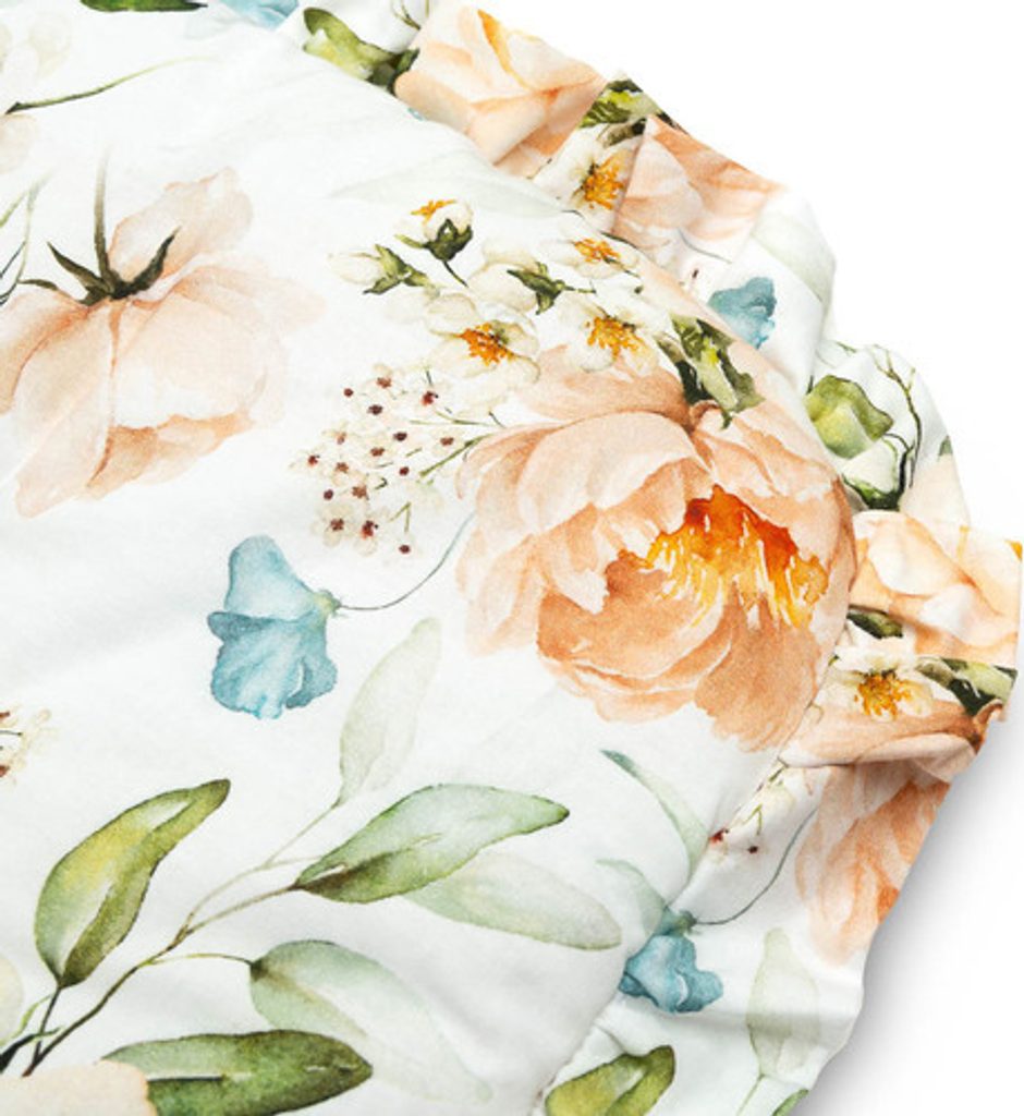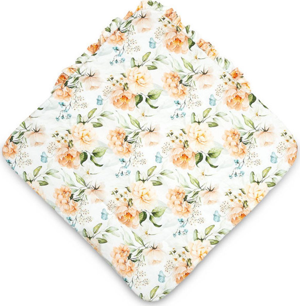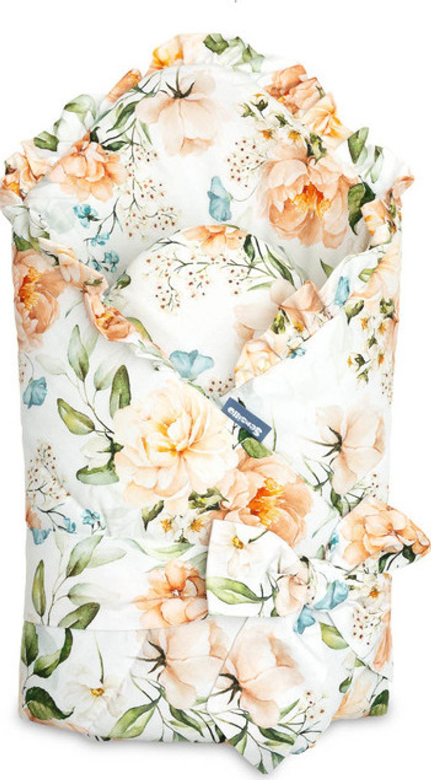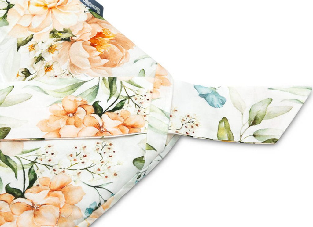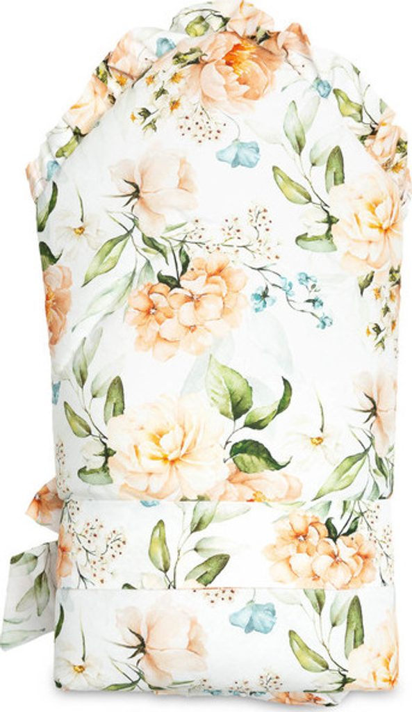 Oboustranná dětská zavinovačka s volánkem byla vytvořena pro novorozence a kojence. Zavazovací zapínání na širokou bavlněnou stuhu umožňuje pohodlné držení miminka při krmení a usínání. Po rozložení lze použít jako peřinku do postýlky nebo kočárku. Dá se použít i jako podložka na hraní. Byl vyroben ze 100% bavlny. Výplň tvoří nadýchaná silikonová netkaná textilie. Kolem je vkusný volán.