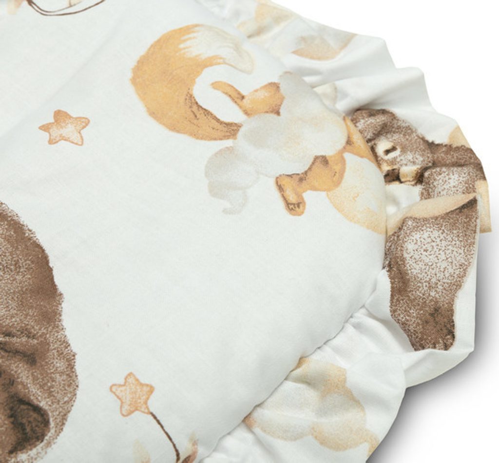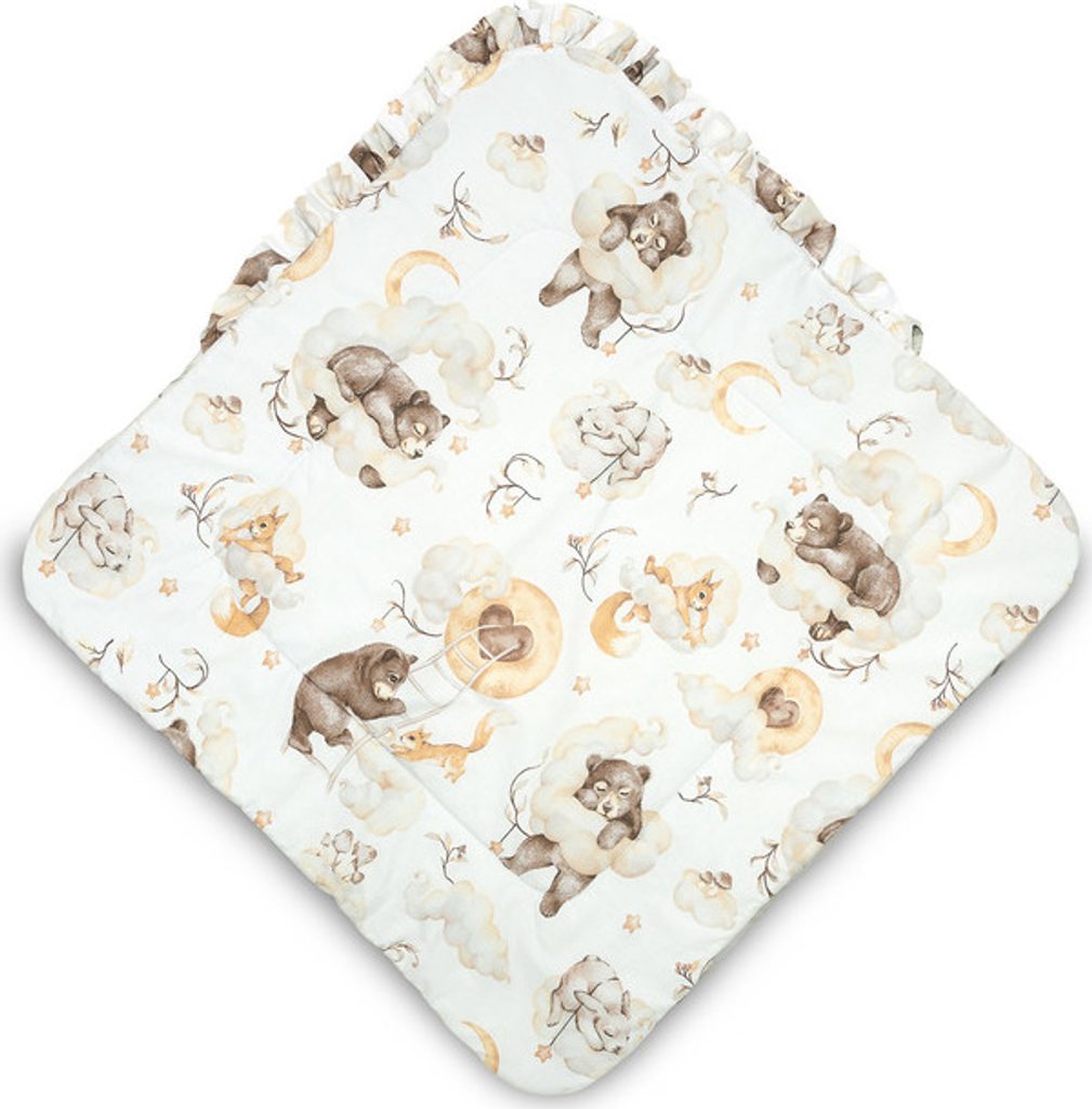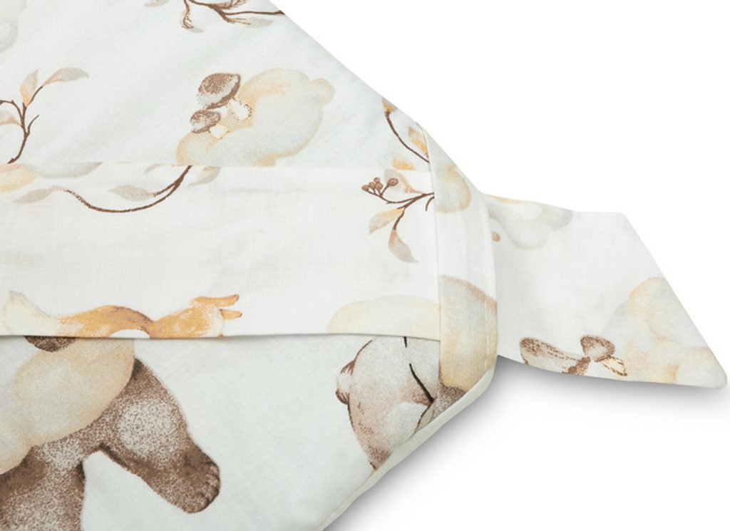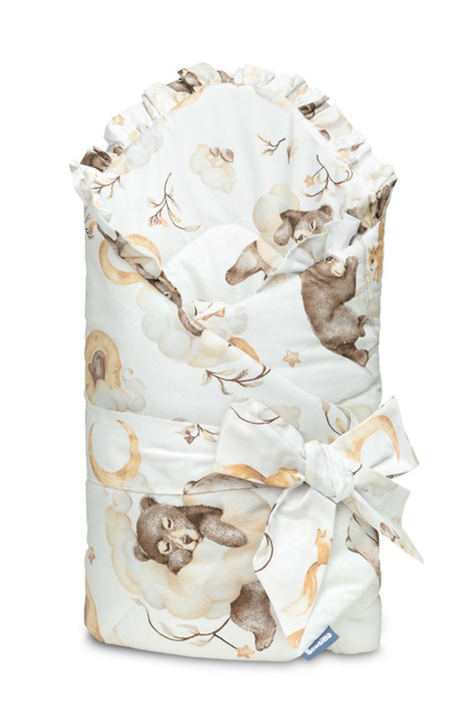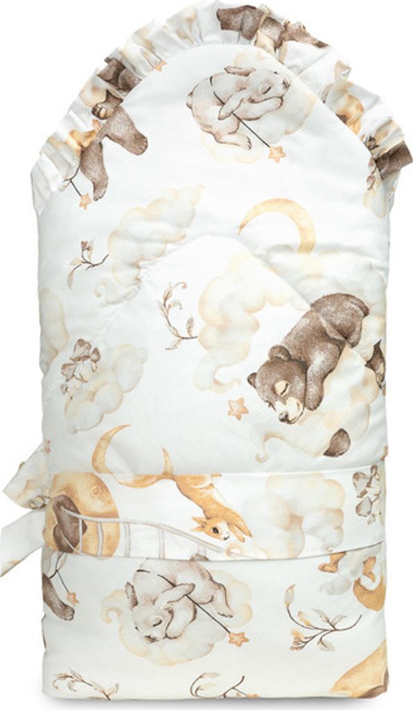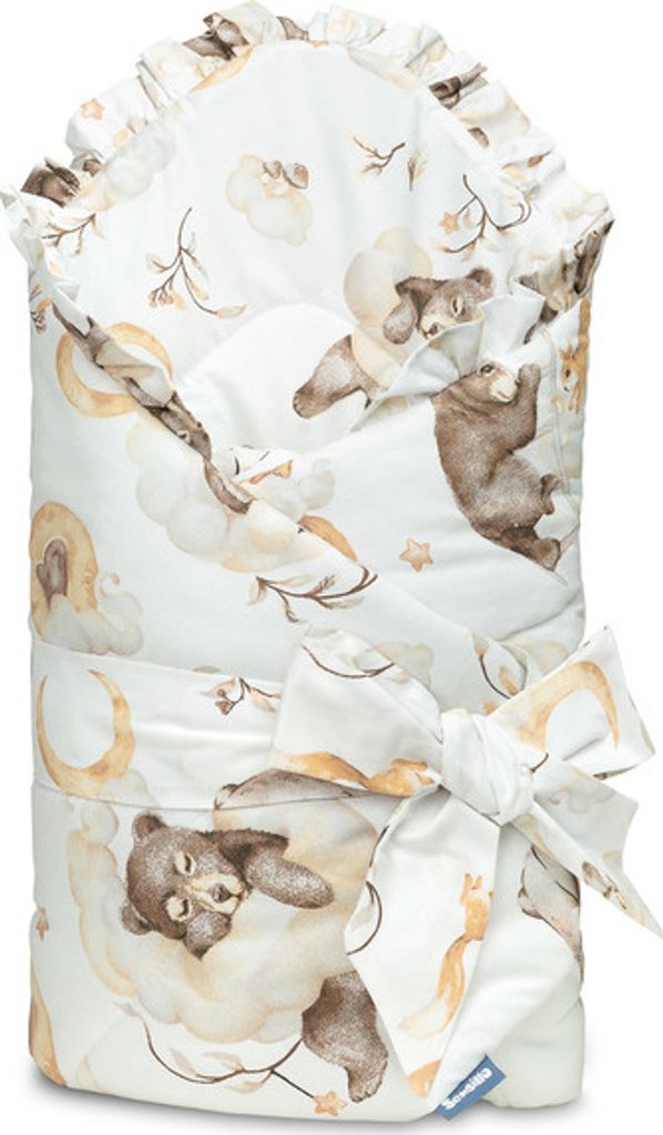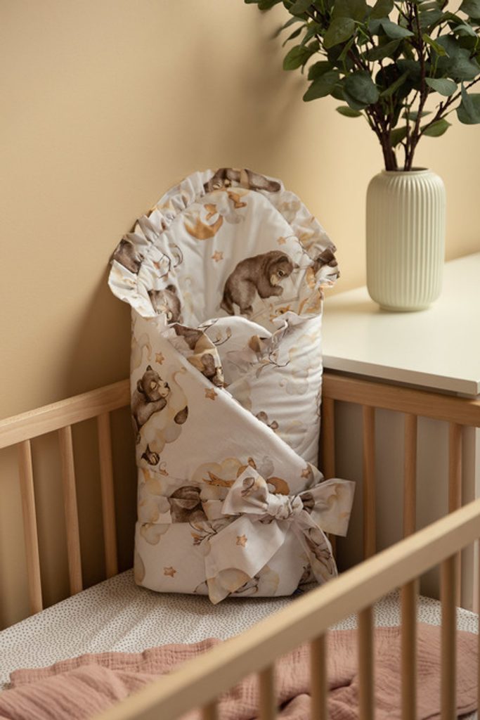 Oboustranná dětská zavinovačka s volánkem byla vytvořena s ohledem na novorozence a kojence. Uzlové zapínání se širokou bavlněnou stuhou umožňuje pohodlné držení dítěte při krmení a uspávání. Po rozložení lze zavinovačku použít jako peřinku do postýlky nebo kočárku. Lze ji použít také jako podložku na hraní. Je vyrobena ze 100% bavlny. Výplň tvoří silikonové nadýchané rouno. Závěrečnou tečkou je vkusný volánek.