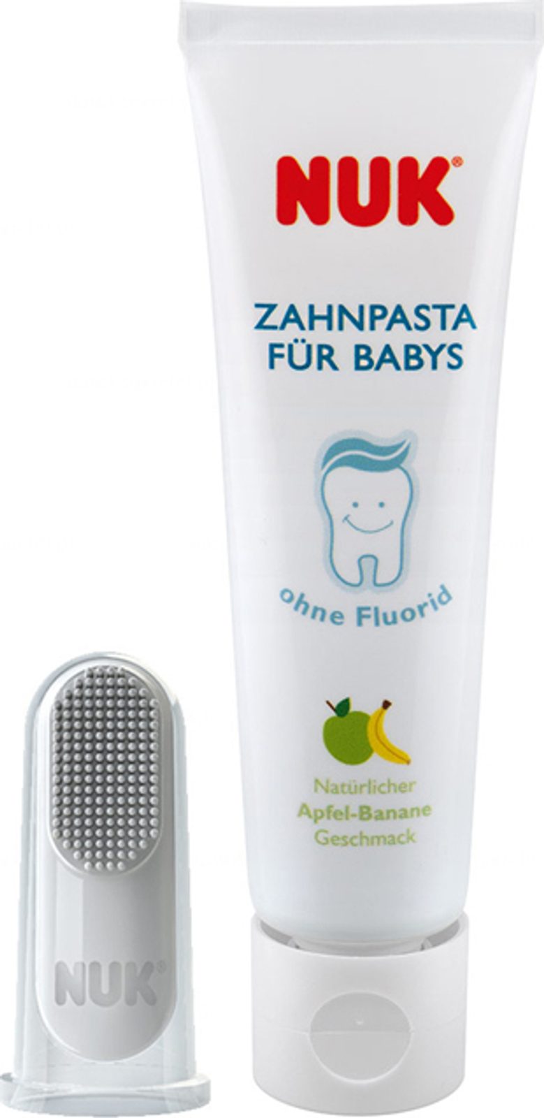 Dětská zubní pasta a náprstek NUK. K čištění prvních zubů a ústní dutiny, pro jemnou masáž dásní. Pro děti od 3 měsíců. Charakteristika: Zubní pasta: - bez fluoridu - přirozená ochrana dásní a zubů - příchuť jablka a banánu - bez cukru a umělých sladidel Náprstek na čištění zoubků: - vyrobeno z vysoce kvalitního silikonu - s měkkými štětinami, které neporaní dásně - jednoduché použití - snadné čištění