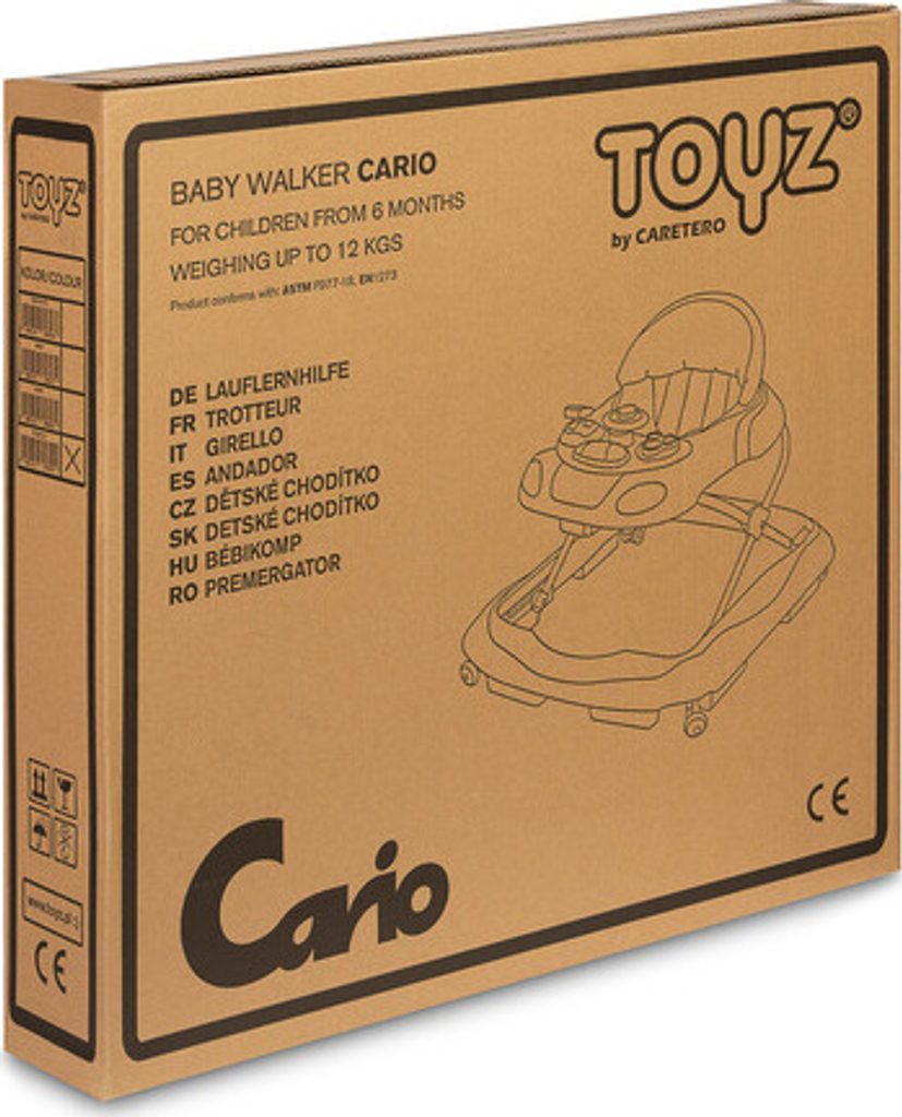 Cario je chodítko značky TOYZ, které v batoleti probudí lásku k motorismu. Chodítko vypadá jako auto. Batole se v něm bude cítit pohodlně díky měkkému opěradlu v sedadle. Nastavení výšky podle výšky dítěte je možné díky speciální konstrukci a stisknutím tlačítka můžete snadno nastavit výšku horní části. Barevný multimediální panel zaměstná pozornost vašeho dítěte a podpoří správný vývoj vašeho drobečka.