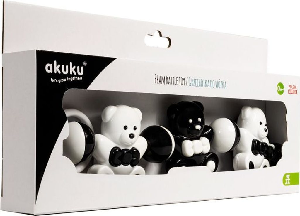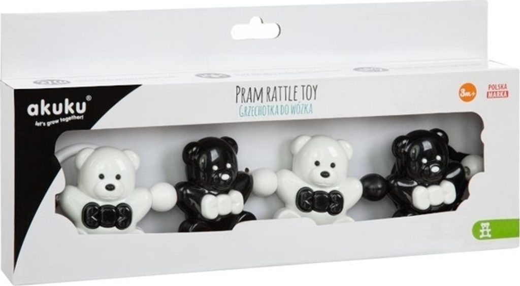 Chrastítka do kočárku Akuku jsou vyrobeny z kvalitních materiálů. Barevné provedení se liší dle aktuální nabídky. Chrastítko můžete připevnit i do dětské postýlky, kolébky či na autosedačku. Výška hračky cca 8 cm.