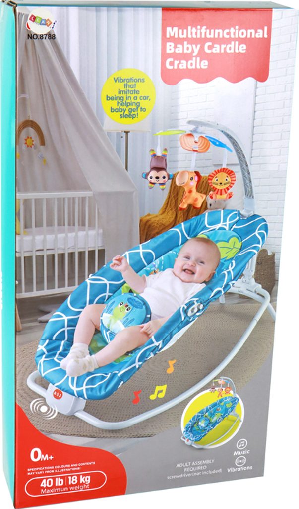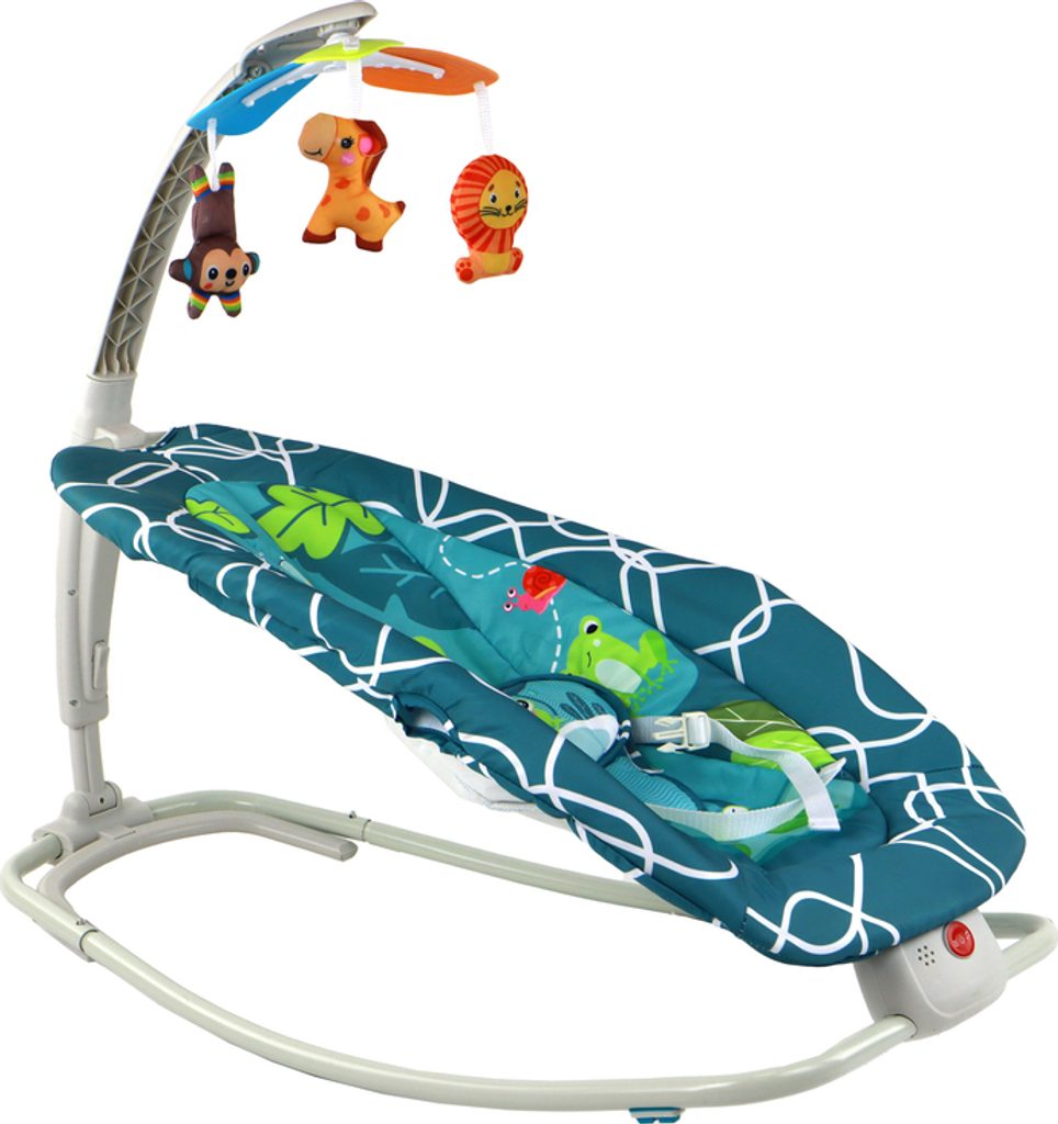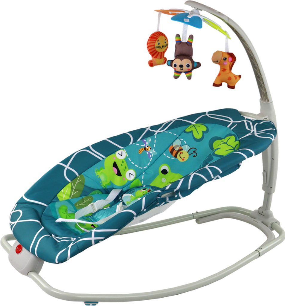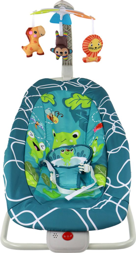 Pro bezpečnost miminka je houpací křesílko vybaveno pohodlnými bílými popruhy. Houpačka je napájena bateriemi (2 x 1,5 V, není součástí dodávky) a nabízí různé možnosti zábavy, jako jsou písničky a vibrace, které vašemu miminku pomohou uvolnit se a usnout.