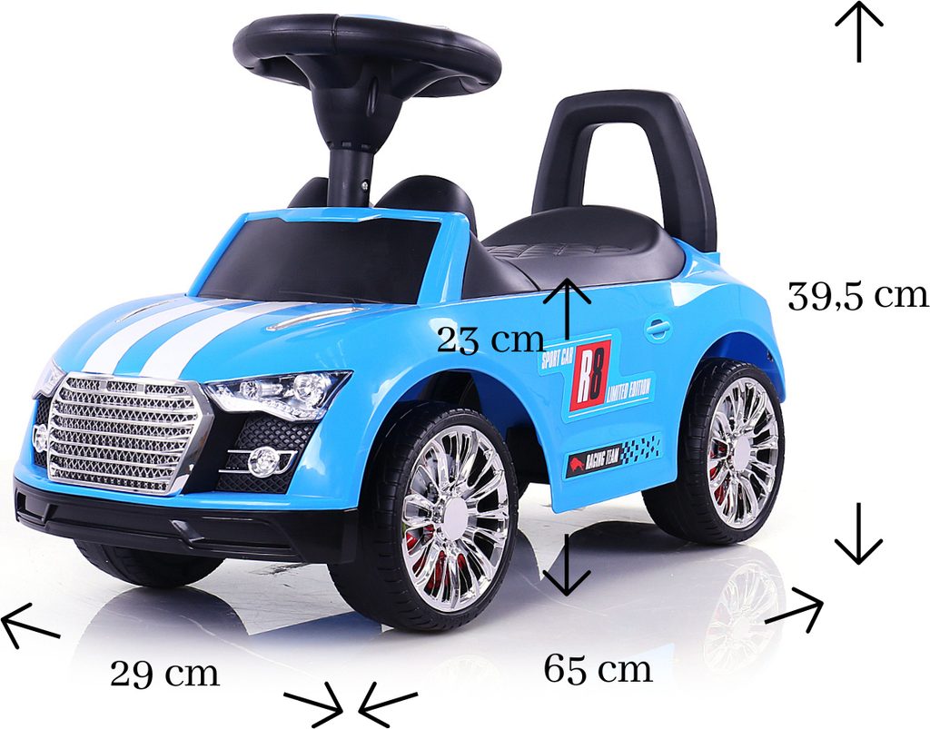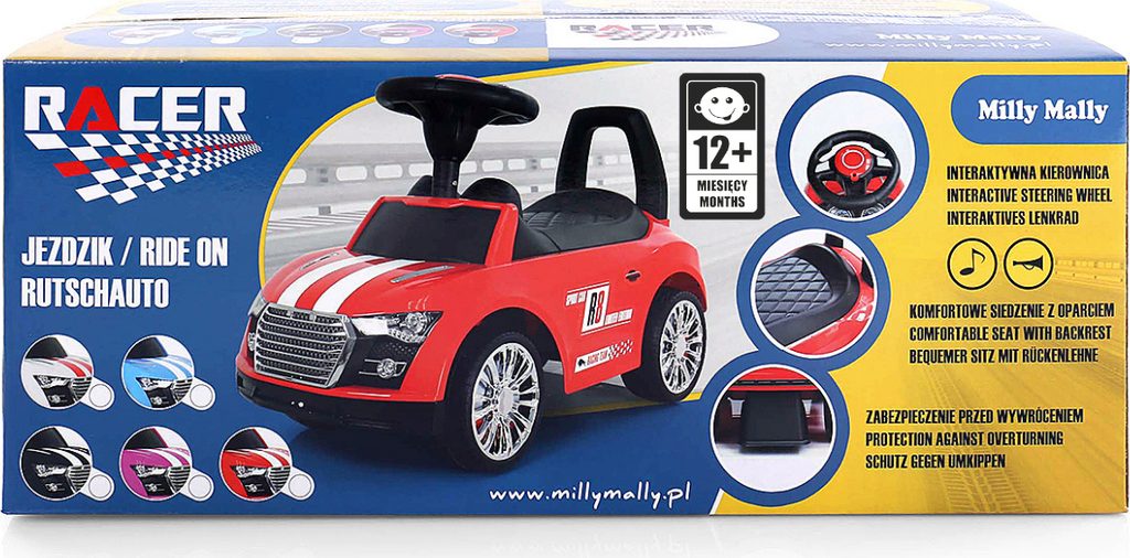 Dětské odrážedlo Milly Mally Racer. Odrážedlo má vzhled sportovního vozu a určite potěší každé dítě. Určeno pro děti od 3 do 6 let. Maximální zatížení 25 kg. Charakteristika: - otočná přední kola - interaktivní volant umožňuje změnu směru jízdy - pohodlné držadlo pro jízdu - prostor (zavazadlový prostor) pro hračky - sedadlo s modelem simulujícím prošívané kůže - plastová kola - moderní vzhled - ochrana proti převrácení vozu Rozměry: vxdxš: 39,5x65x29 cm Výška odrážedla po volant je 39,5 cm. Výška odrážedla po opěrku je 23 cm. Průměr kola je 14 cm. Pro děti od 3 let.