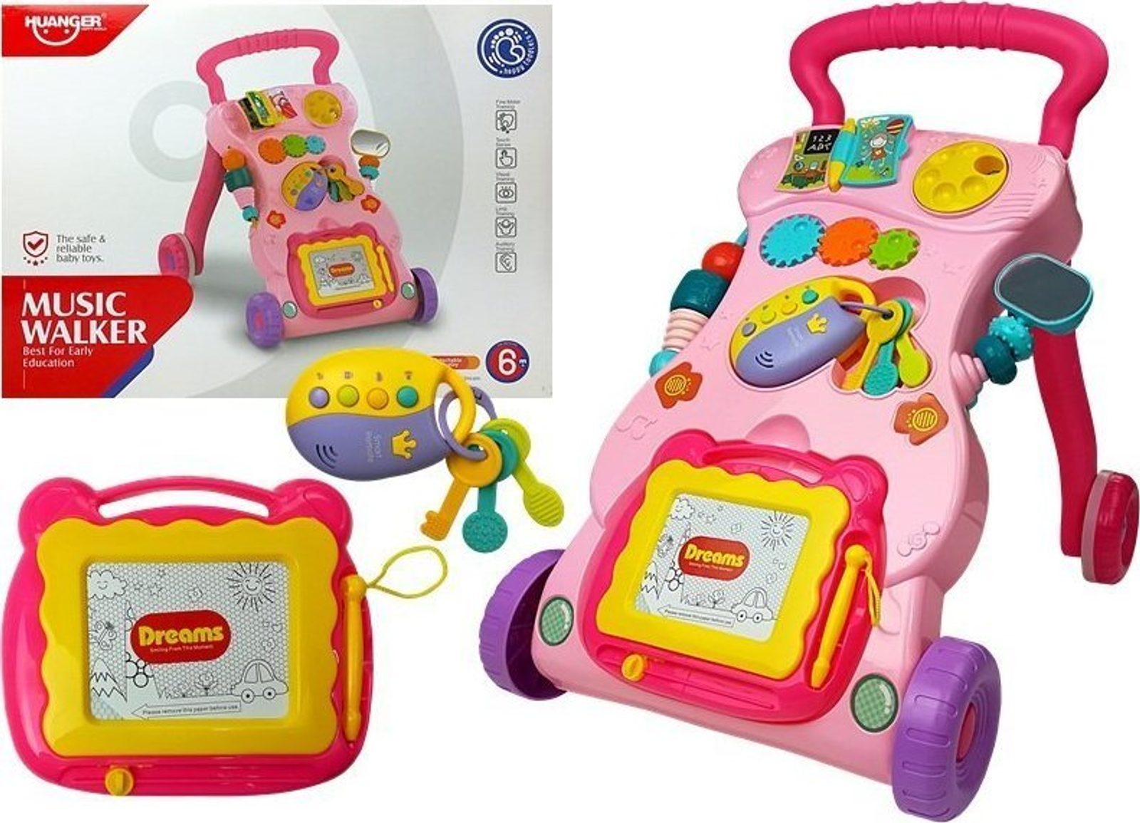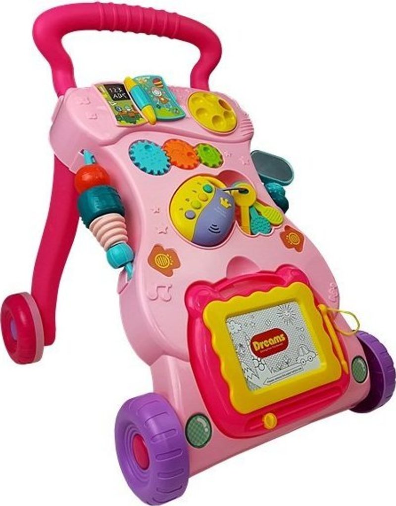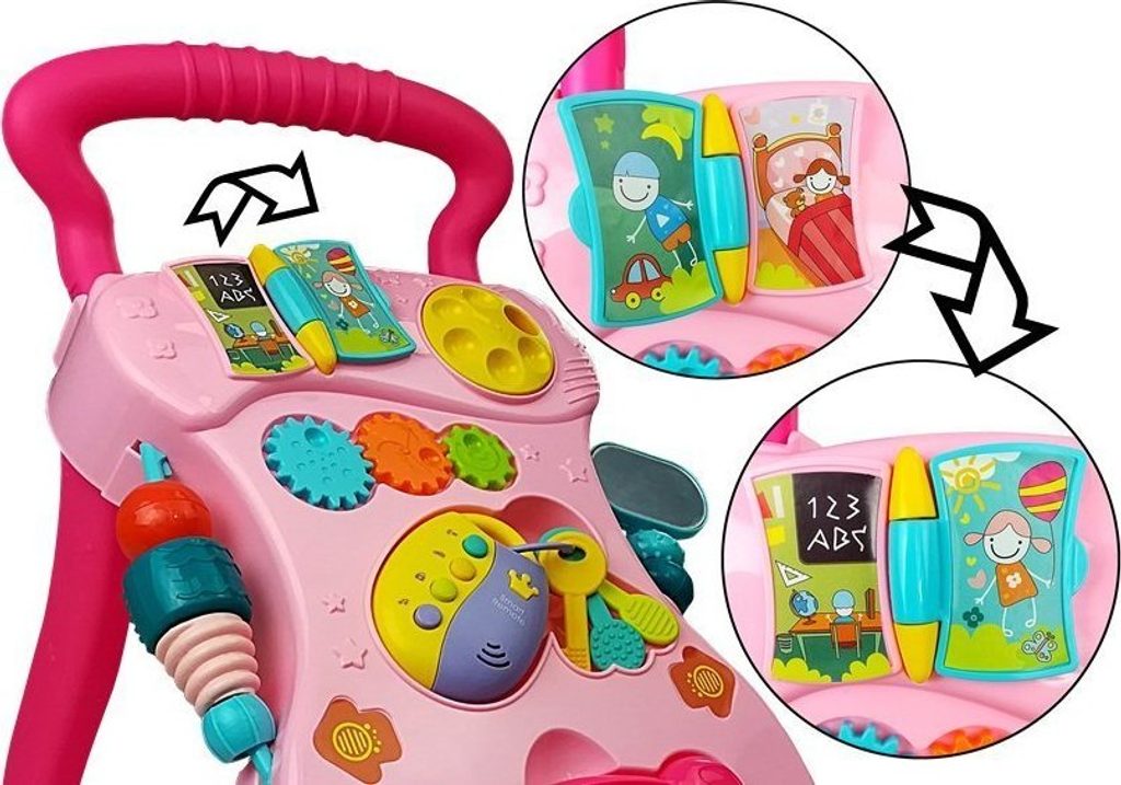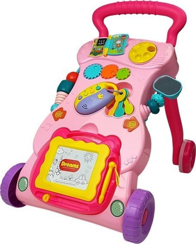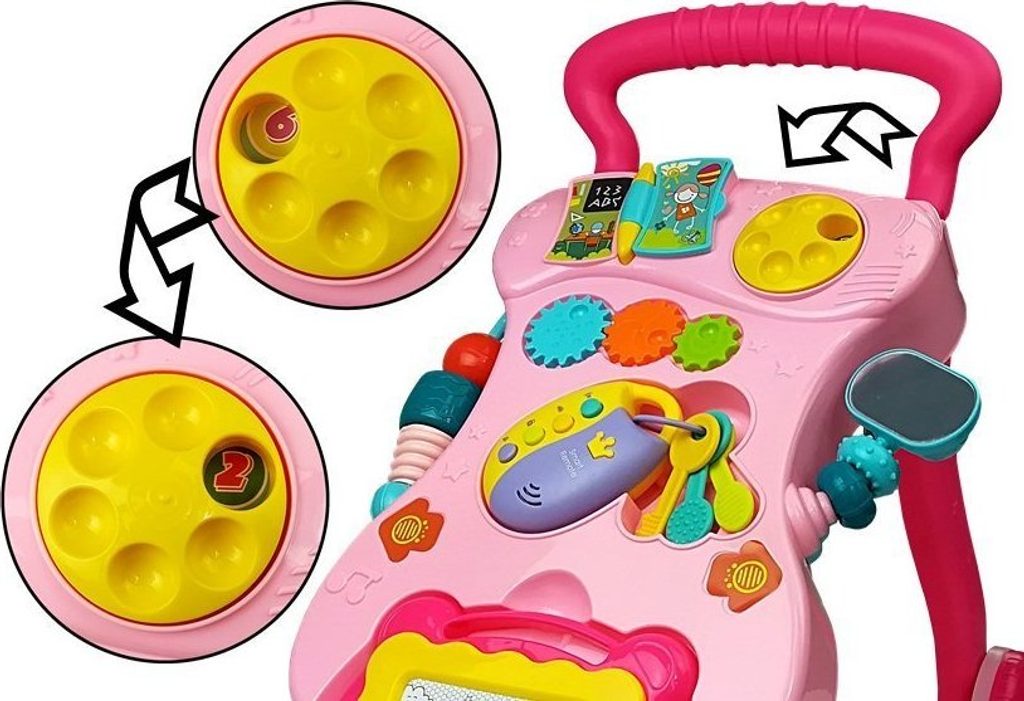 Odstrkovadlo je perfektním řešením pro děti, které se plazí nebo samy dělají první krůčky: bude to zábavný způsob, jak povzbudit vaše dítě, aby se naučilo chodit, a zároveň mu poskytne spoustu zábavy. Hračka má pozitivní vliv na rozvoj motoriky dítěte a zlepšuje smysl pro zrak a sluch. Vaše ratolest si může hrát s otočnými chrastítky a klíči.