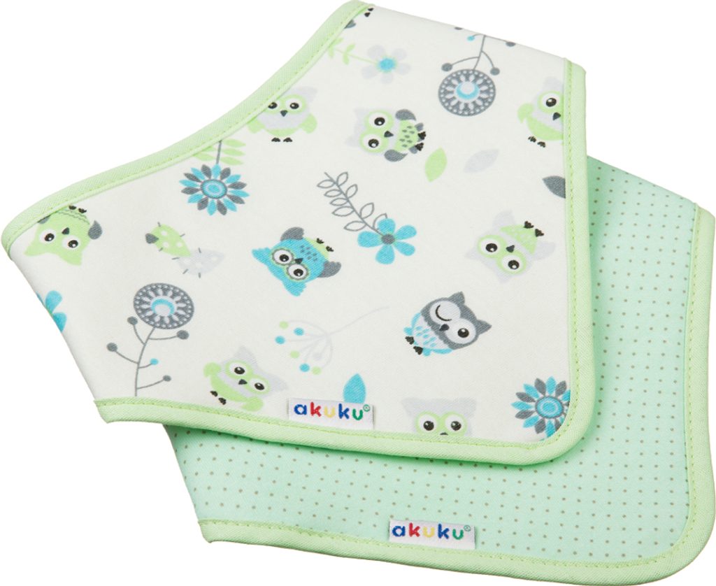 Praktický dětský bryndáček-šátek Akuku. Bryndáček s jednou vrstvou z jemné froté bavlny a druhou vrstvou hladké bavlny, chrání jak citlivou dětskou pleť, tak i oblečení před ušpiněním. Bryndáček je vhodný pro malé děti, kterým rostou zoubky a nadměrně slintají, a také slouží jako módní doplněk k oblečení. Praktické zapínání na suchý zip. Složení: 100 % bavlna. Rozměry: 38 cm (obvod kolem krku) x 16 cm (délka od krku). Sada obsahuje 2 šátky.
