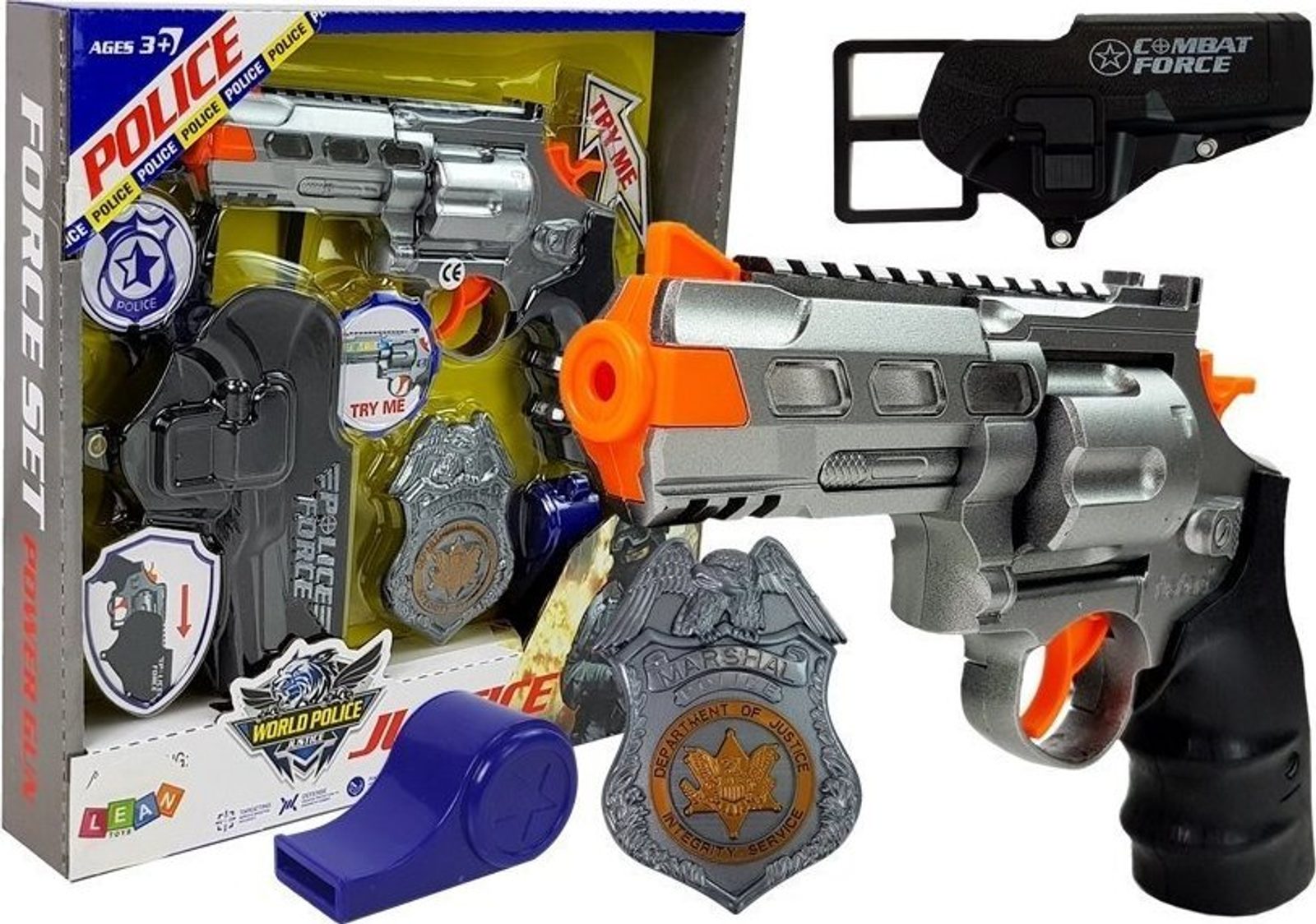 Sada pro mladého uniformovaného důstojníka se skládá ze čtyř prvků. Všechny jsou vyrobeny z vysoce kvalitního materiálu, který zaručí, že budou Vašemu dítěti dlouho sloužit. Pistole je vyrobena ve stříbrné a černé barvě. Puška vydává zvuk výstřelu, stačí stisknout spoušť. Žádný zloděj neuteče! Fantazie vašeho drobečka se určitě rozvine. Další výhodou je světelný efekt při střílení.