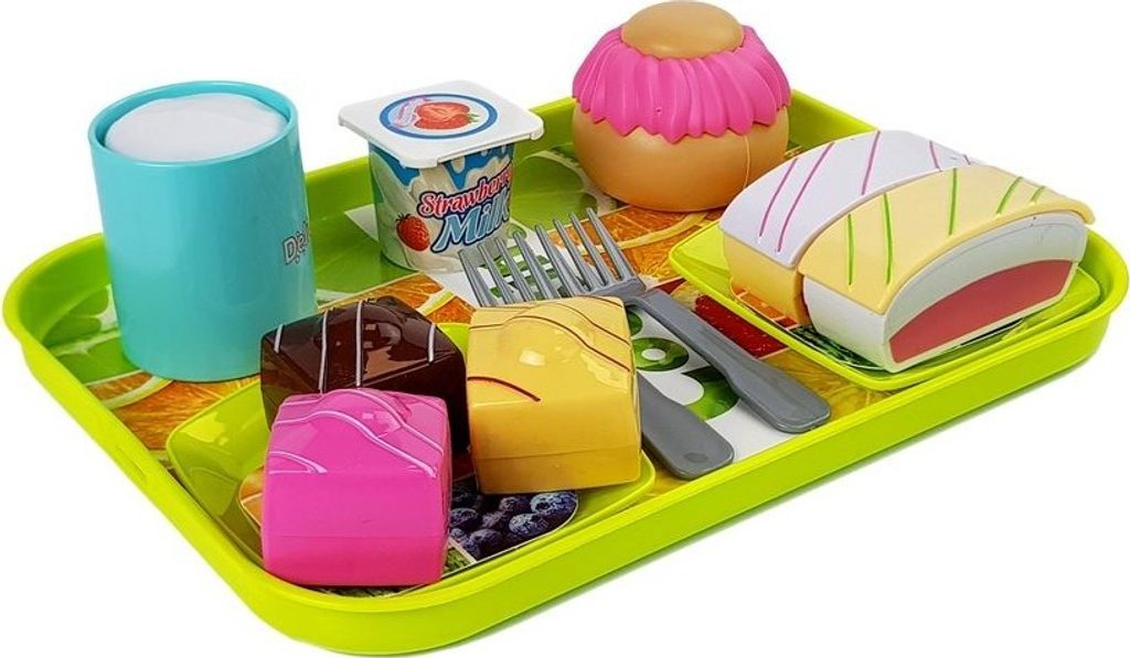 - podnos - 2 talíře - 2 vidličky - jogurt - 2 malé kousky dortu - 2 velké kousky dortu - cupcake - hrnek s bílou čokoládou