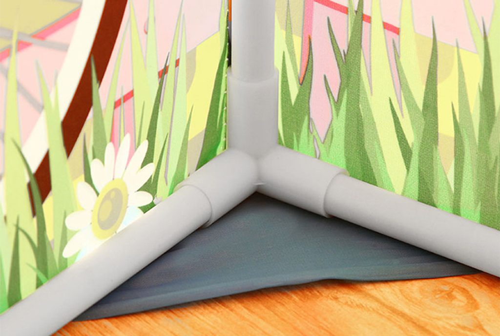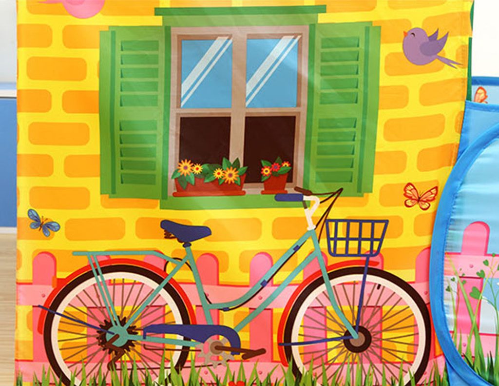 Ideální pro dům nebo zahradu Barevný motiv domku s plotem Dva kruhové vchody Stabilní rám Rychlá a jednoduchá montáž
