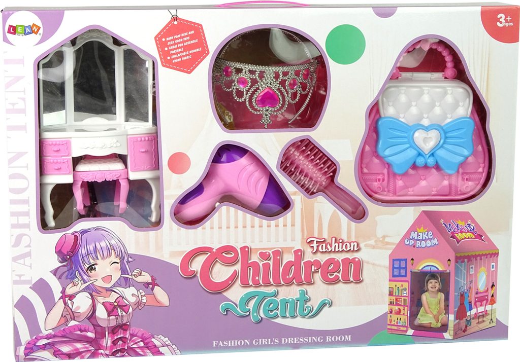 Kosmetický salon vašeho dítěte má veškeré příslušenství potřebné k přípravě. Malý toaletní stolek se zrcadlem, fénem a kartáčem jsou jen některé z doplňků. Umožňují vám nalíčit vaše panenky nebo účes. Pro ni sada obsahuje krásnou korunku a tašku s modrou mašlí.