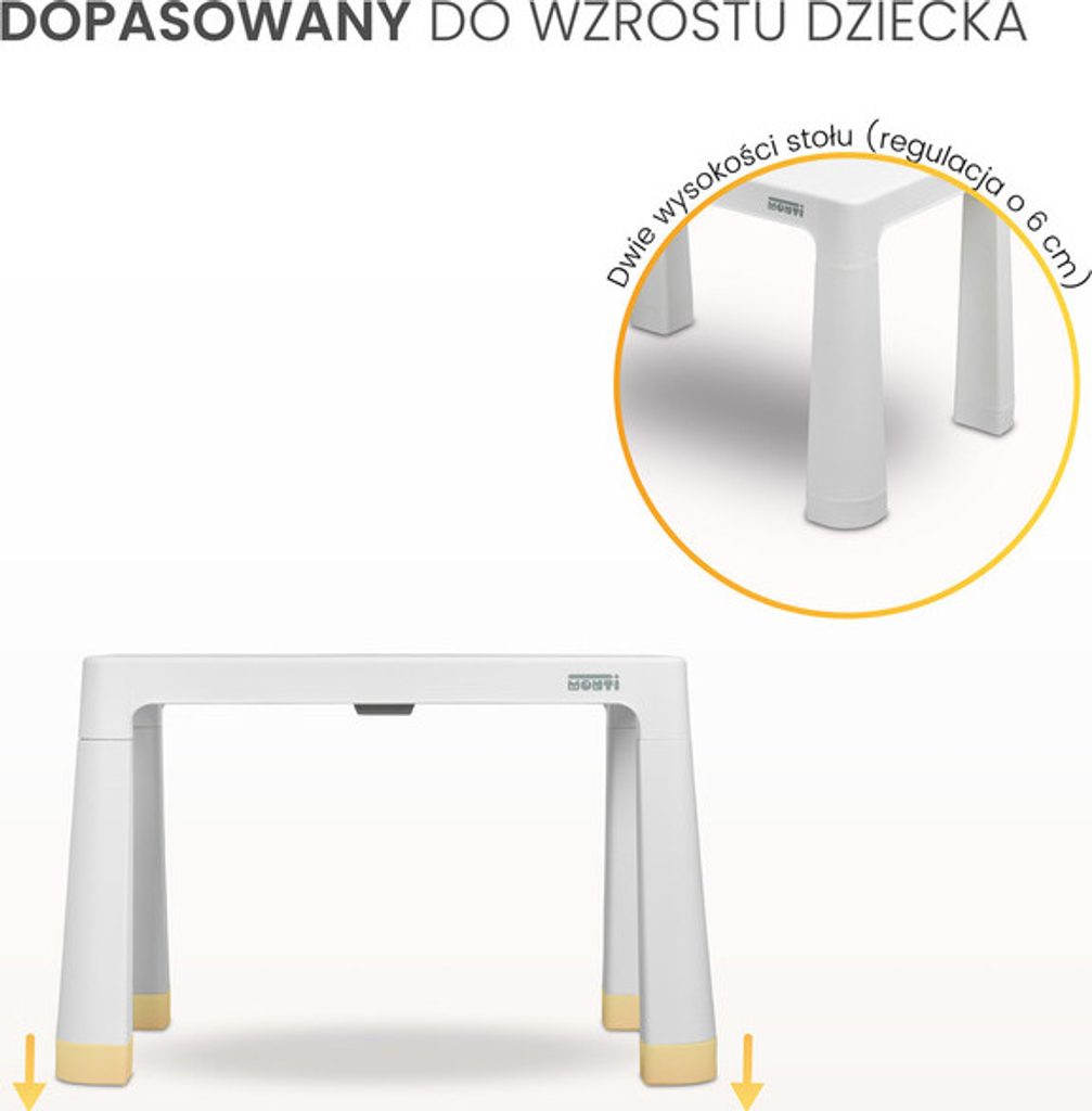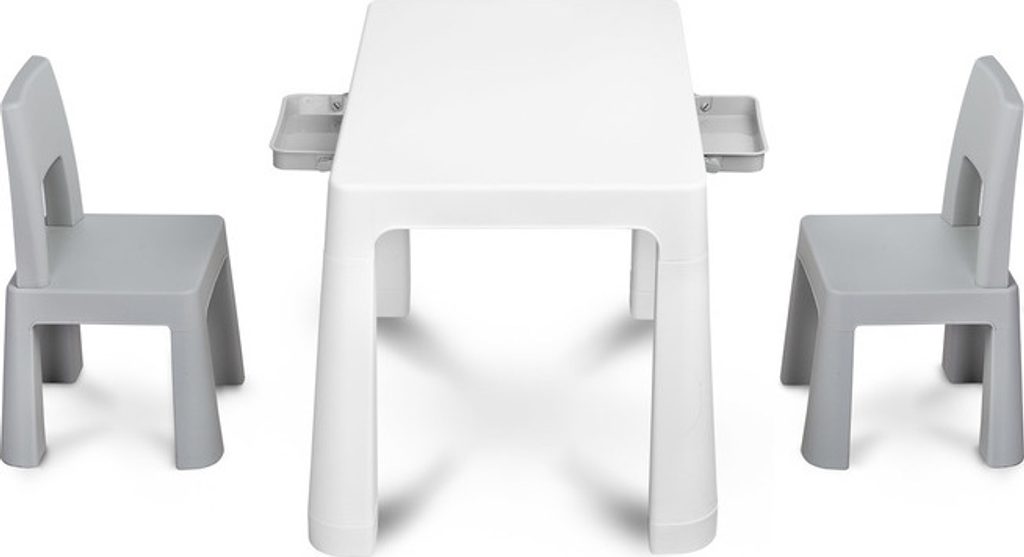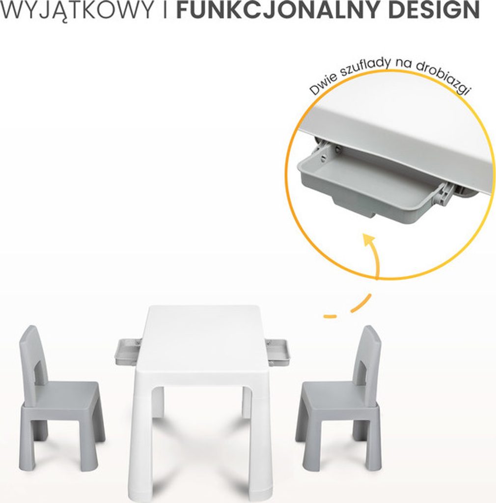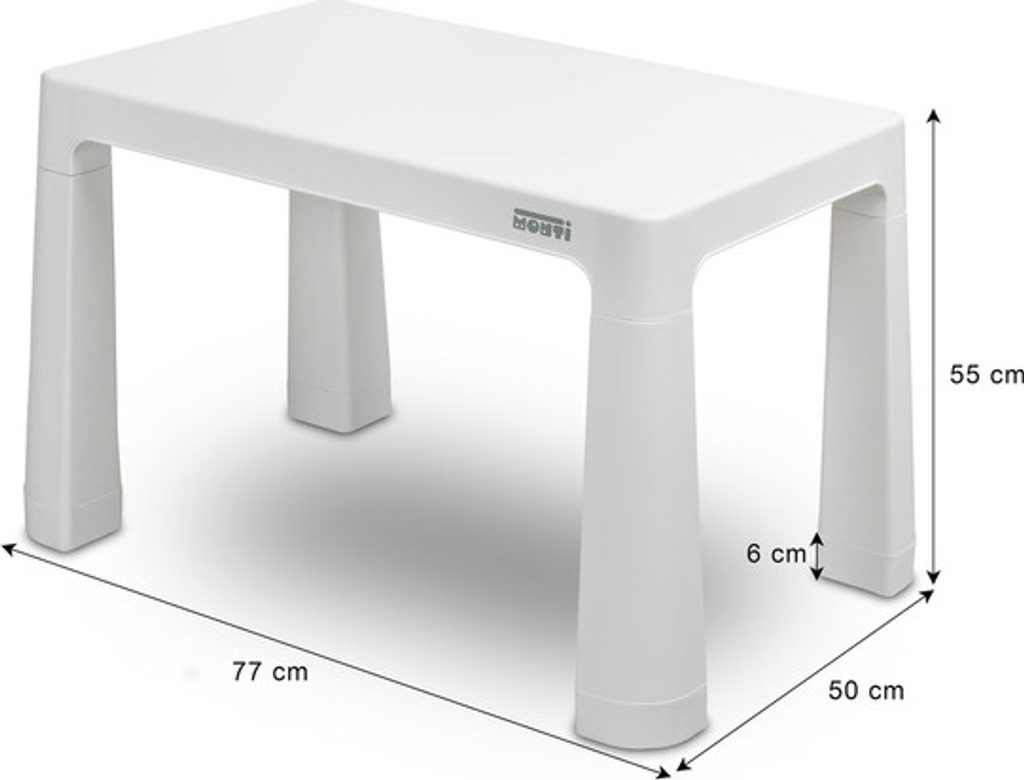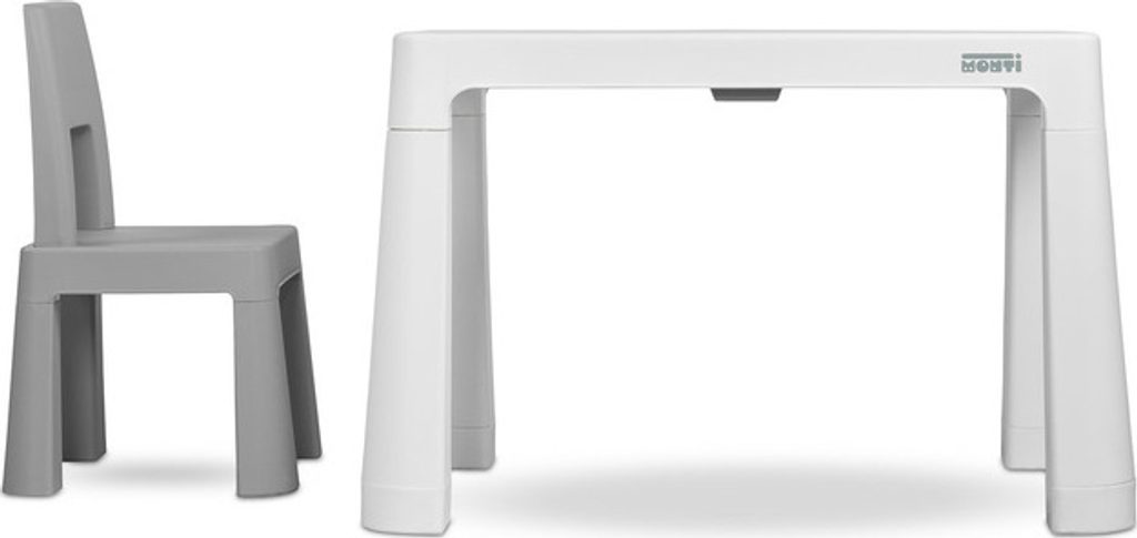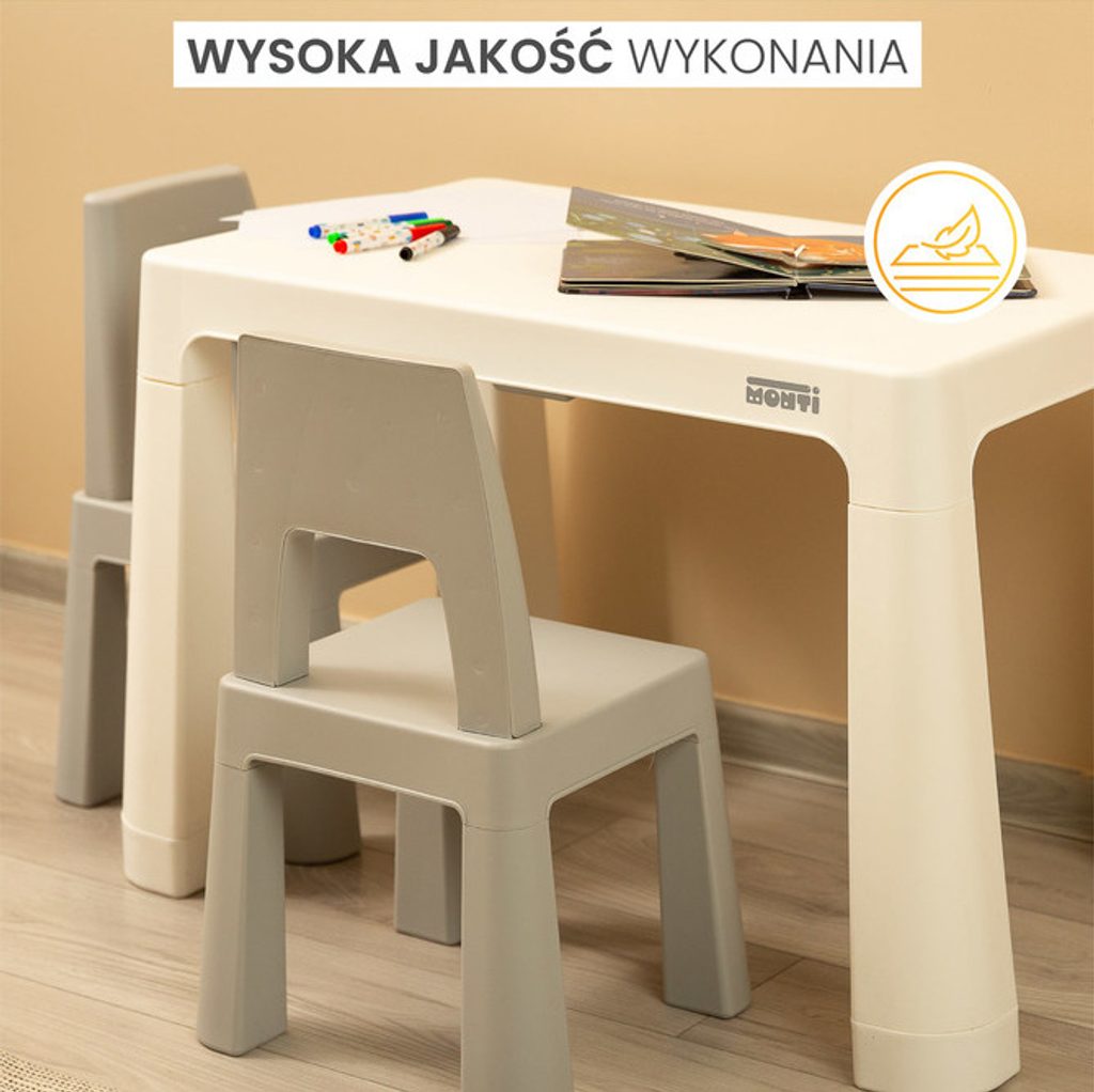 Monti je všestranný dětský stůl se židlemi. S jeho pomocí si snadno vytvoříte koutek pro uměleckou práci nebo zábavu doma i venku. Sada je vyrobena z kvalitního plastu - bezpečného a odolného vůči různým rozmarům počasí a divokým hrám. Stůl i židle jsou lehké, takže je dítě může nosit samo. Díky jednoduchému designu lze Monti snadno sestavit - stačí prvky k sobě přitlačit. Stůl má 2 šuplíky, které se schovají pod desku stolu a také je možné snížit výšku o 6 cm.