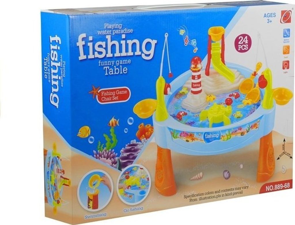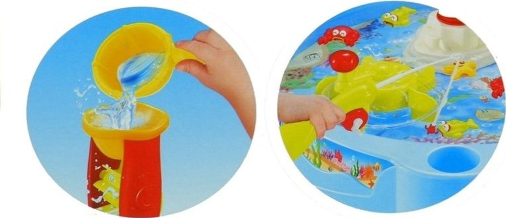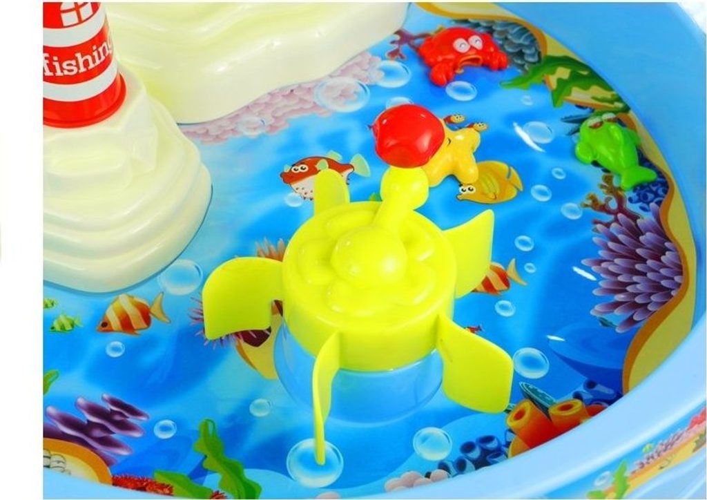 Stůl s bazénkem má speciální efekty - hračka hraje a svítí . Stisknutím majáku se hračka zapne a poté vypne. Zajímavé je, že všichni mořští tvorové v bazénu mají magnet , který usnadňuje jejich vylovení z hlubin vody.