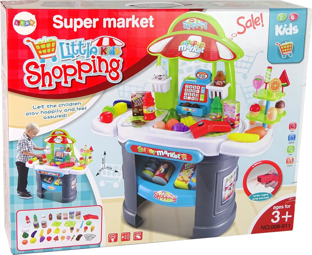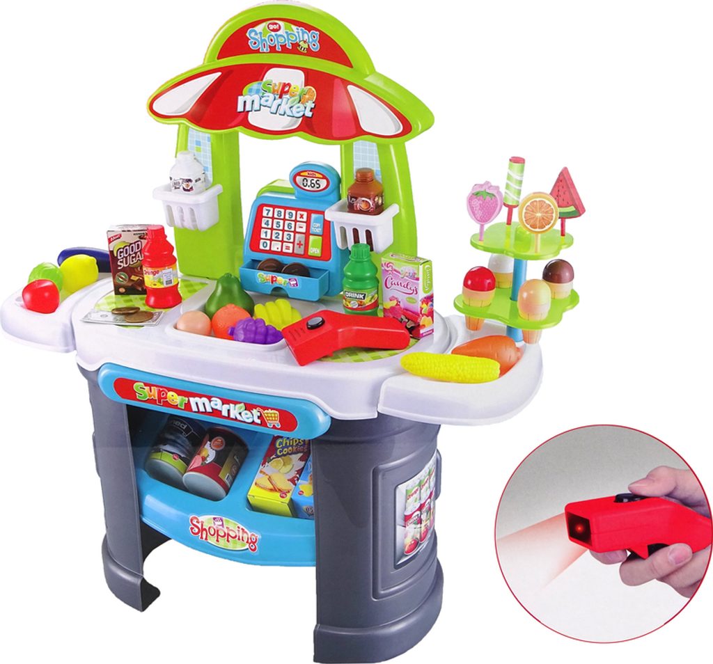 Dětský supermarket je fantastická vzdělávací hračka, se kterou si děti mohou hrát a poznávat svět kolem sebe. Děti se naučí poznávat různé druhy produktů a zeleniny. Je to všestranná sada pro každodenní hraní v obchodě a hlavně bezpečný nákup potravin. Dítě se bude cítit jako opravdová pokladní. Hra rozvíjí logické myšlení a představivost a mohou se snadnou a zábavnou formou naučit pravidla nakupování nebo hodnotu peněz. Fantastický nápad pro hraní domu, nakupování nebo prodej. Vícedílná sada doplní dětský pokoj a poskytne zábavu na celé hodiny. V celém supermarketu jsou skříně a police na potraviny. Při nákupu je naskenujte skenerem, uslyšíte pípnutí a červené světlo. Supermarket může být skvělým doplňkem pro jakoukoli hru vašich dětí. Sada obsahuje: - pokladna - supermarket - bankovky - mince - sladký stánek - zmrzliny - lízátka - zelenina: mrkev, lilek, kukuřice - ovoce: hrozny, banán, citron, jablko, hruška, pomeranč - vejce - kartonové obaly napodobující různé výrobky - plastové obaly imitující mléko, konzervované ovoce - plechovky napodobující různé výrobky - řada polic a košů na potravinářský sortiment
