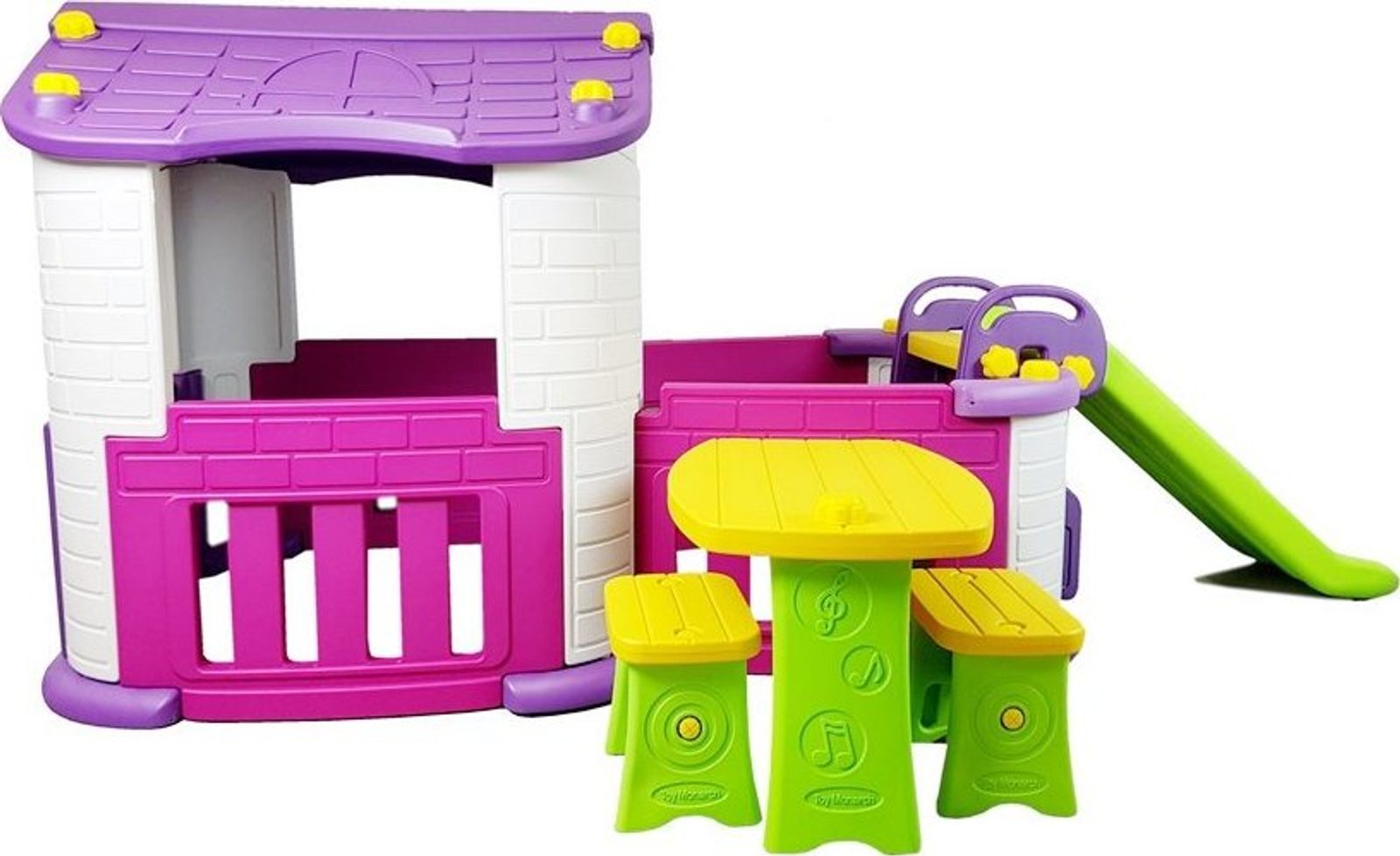 Sada obsahuje velký, prostorný dům se širokými, otevíracími dveřmi. Z domu vyjdeme na oplocenou zahradu, v jejímž středu je vstup na skluzavky. Dvojitá plastová skluzavka s dlouhou a širokou skluzavkou dosahující 110 cm potěší každé batole. Široké a stabilní schůdky umístěné v zadní části skluzavky nám umožní bezpečný výstup na vrchol. V přední části, přímo před domem, je stůl se dvěma židlemi.