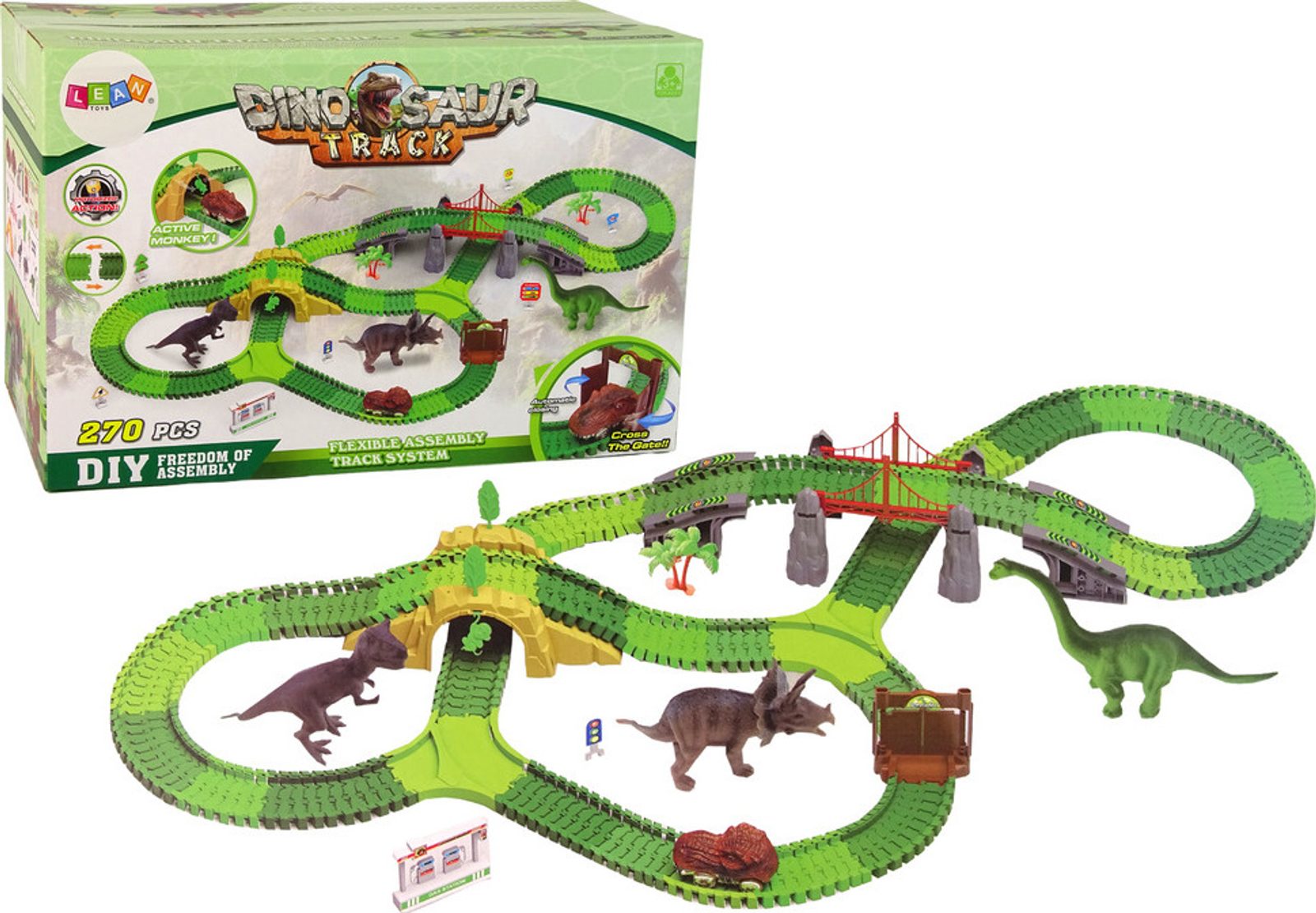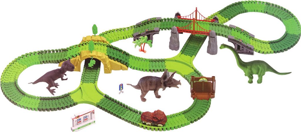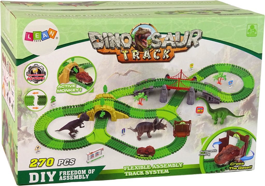 Dinosauří dráha se skládá ze sady jednoduchých drah, které lze snadno spojovat do konfigurací a vytvářet tak různé dinosauří dráhy. Součástí sady jsou také barevné a realistické figurky těchto velkolepých tvorů, které upoutají pozornost a povzbudí děti ke hře. Sada obsahuje také prvky, jako jsou rostliny a stromy, které lze umístit vedle dráhy a vytvořit tak realistickou scenérii, což umožní dětem vytvářet vlastní příběhy o dinosaurech a hrát si ve světě, který si vytvořily.