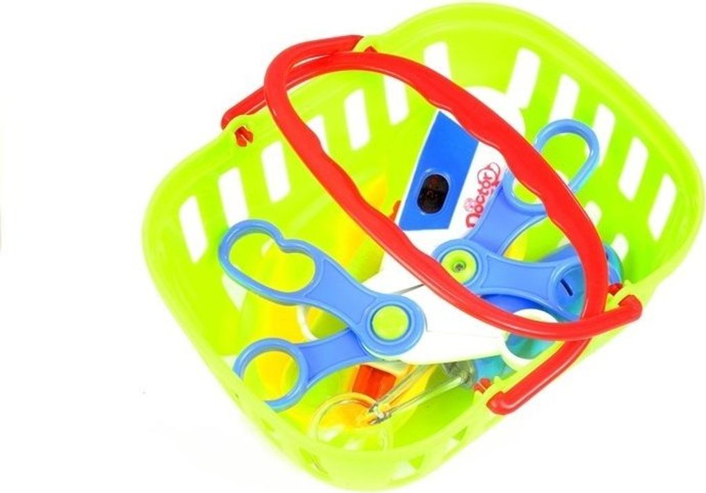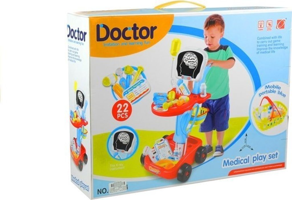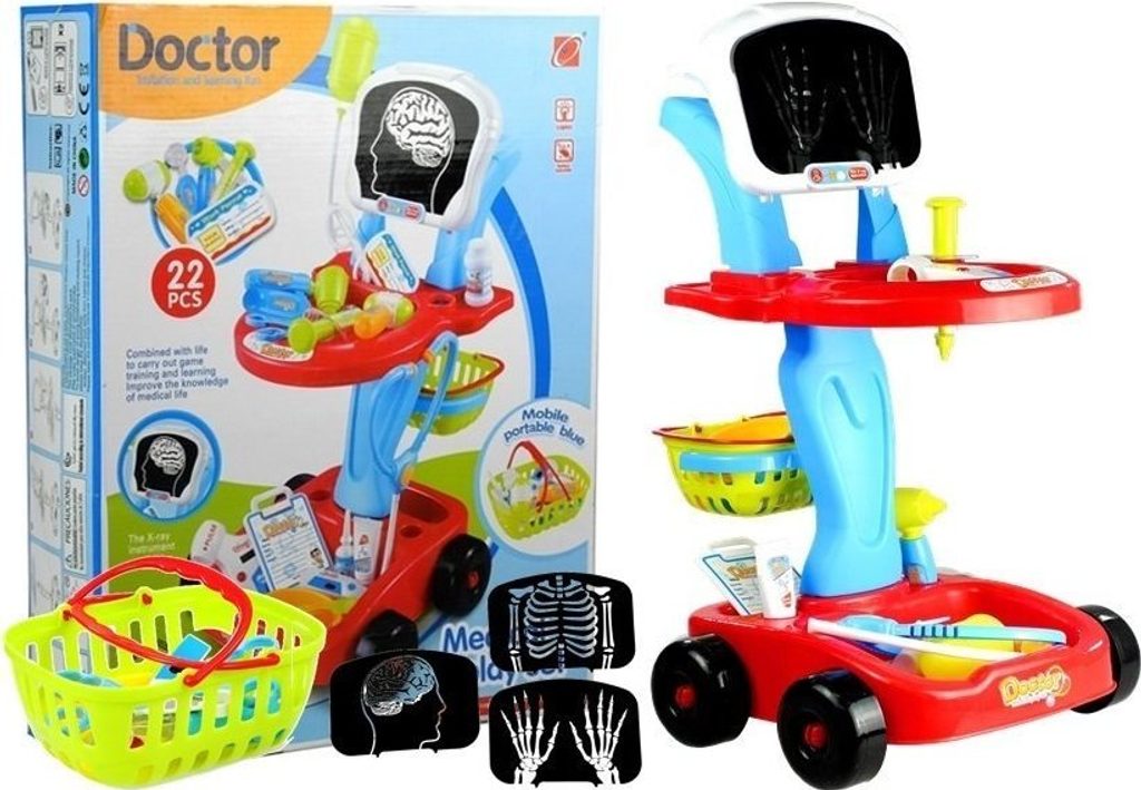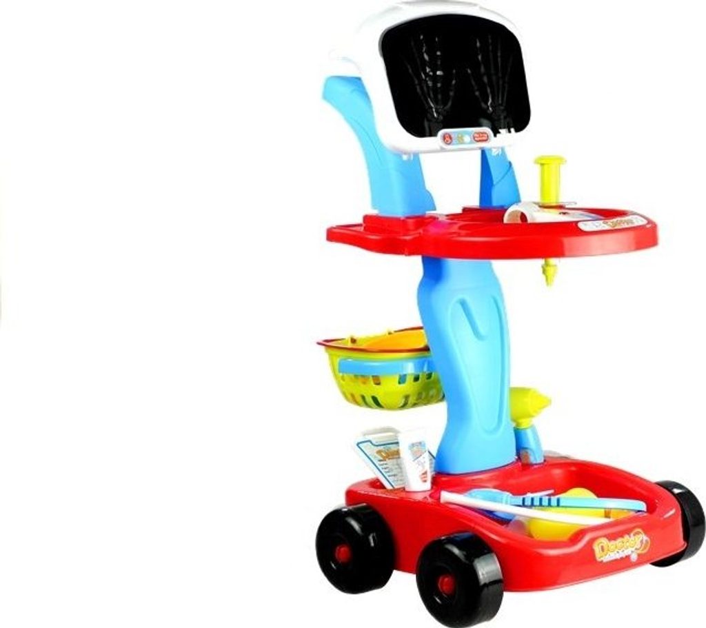 Dobře vybavená lékárnička. Ideální pro nejmenší, kteří si rádi hrají na doktory. Stabilní vozík na čtyřech kolečkách s madlem, košíkem, dvěma policemi na zdravotnické potřeby a deskou.