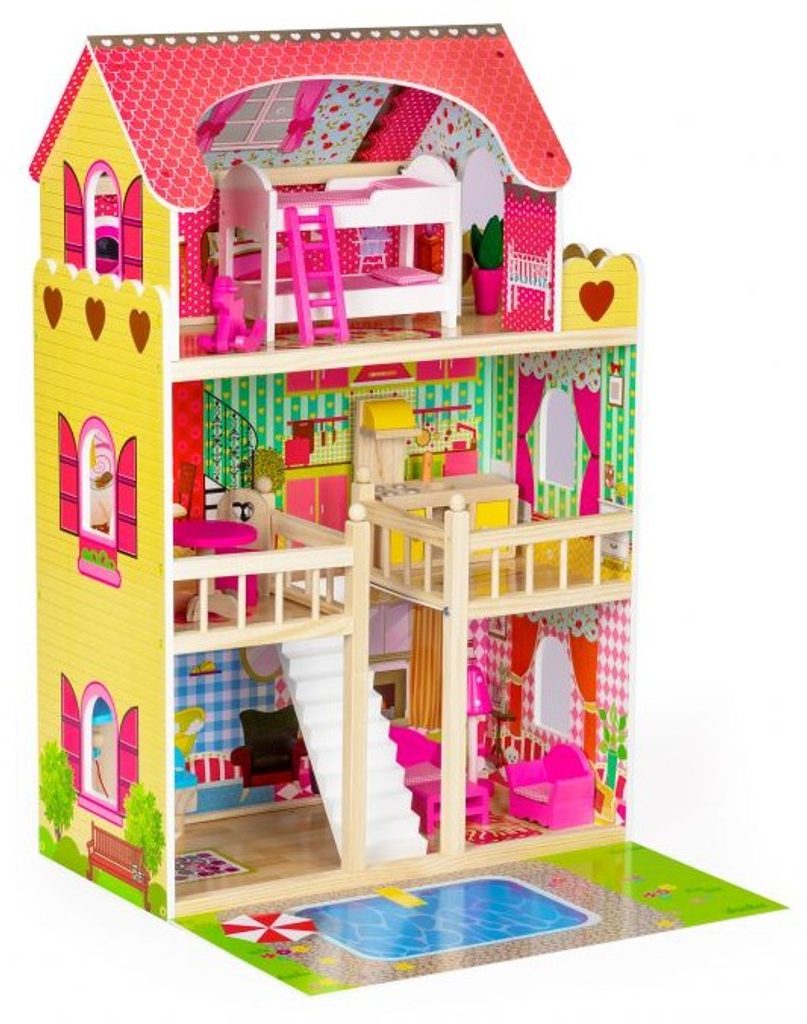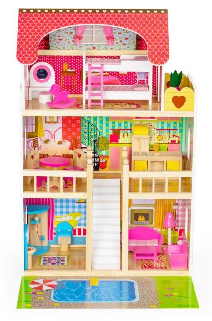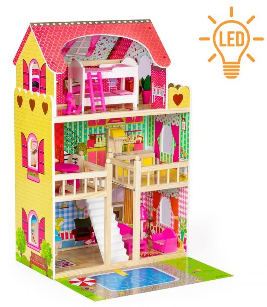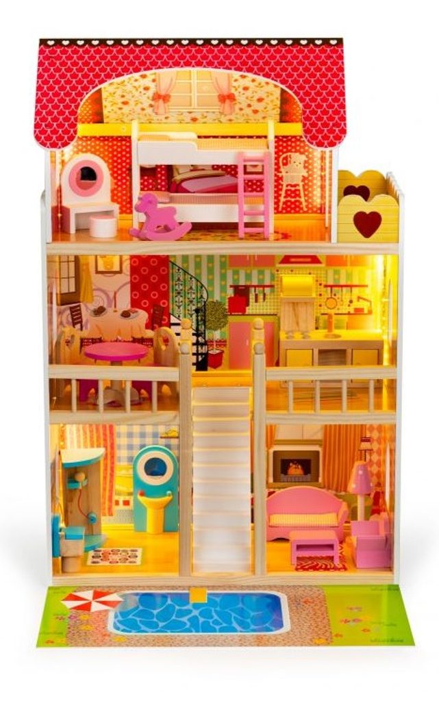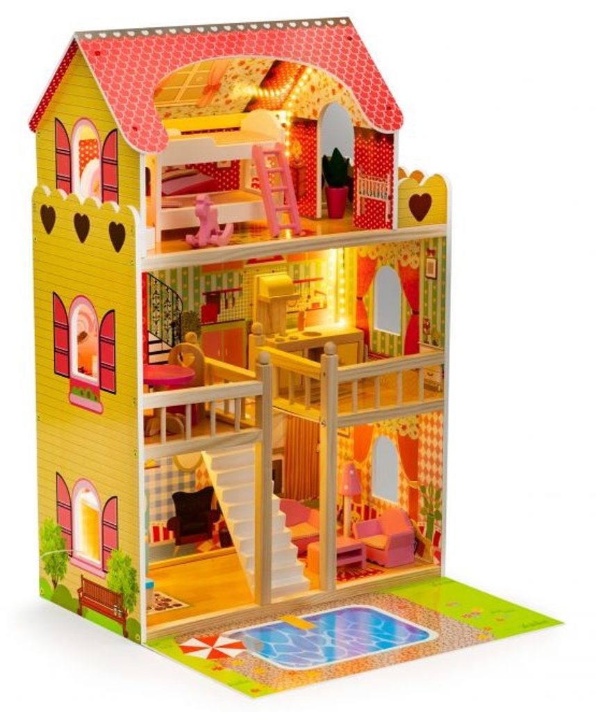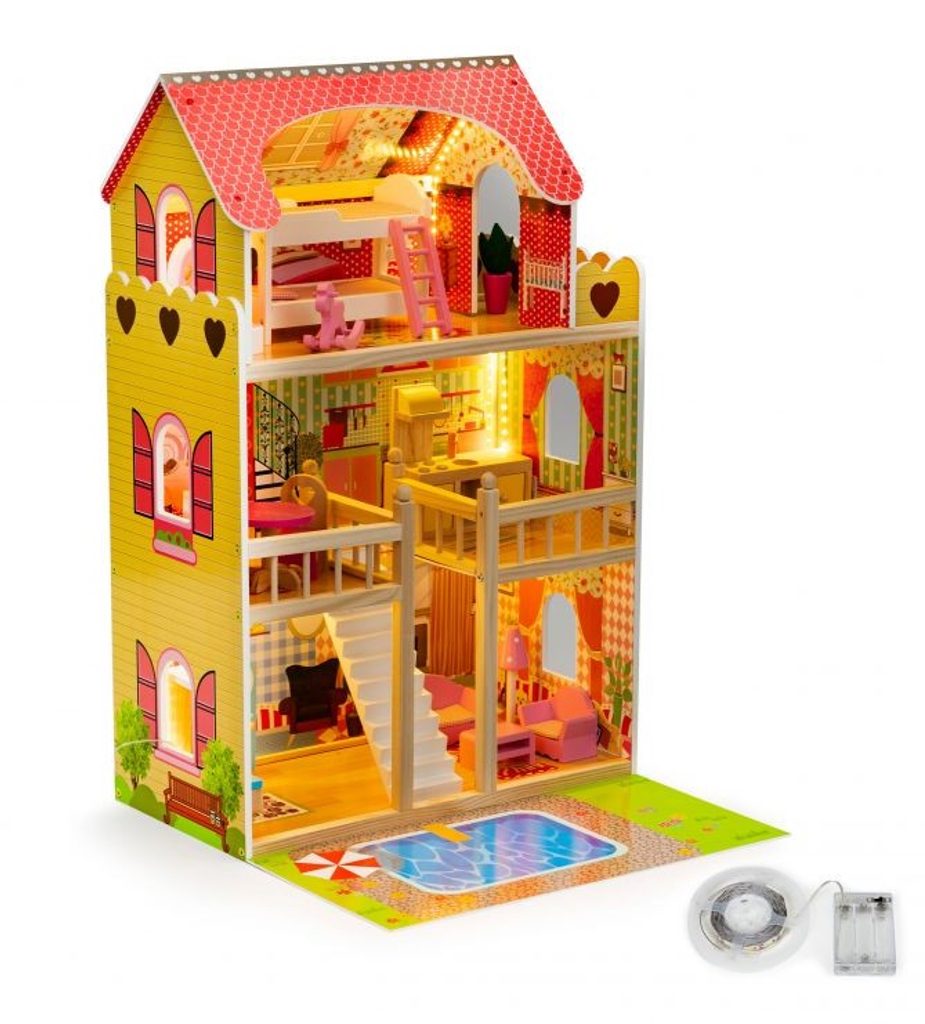 Domeček pro panenky s garáží rezidence Rezidence Florence má 3 nezávislé úrovně, ve kterých jsou celkem 4 pokoje, velká terasa a balkón-vše imituje dokonale skutečný bytový dům. Každý pokoj byl dokončen v jiném stylu, přizpůsoben byl dekor a nábytek charakteru a účelu místnosti. Součástí soupravy je také sada 16 ks dřevěného nábytku, který lze bez omezení přesunovat. Každý kus nábytku je vyroben ručně, s velkou pozorností k detailu a nejvyšší kvalitě provedení, bylo také dbáno na odstranění ostrých hran, které jsou zásadní pro bezpečnost Vašeho dítěte. Domeček pro panenky je nepochybně nejlepší dárek, který můžete dát Vašemu dítěti! Každá dívka sní o takovém domečku! Rezidence bude vypadat dobře nejen v dětském pokoji, ale i v obývacím pokoji, což povzbudí potěšení všech členů domácnosti. Nemusíte se starat o sestavení domu - jasná příručka s obrázky a číslování všech prvků Vám umožní rychle a efektivně sestavit dům. Je vhodný pro všechny panenky typu Barbie do výšky 24 cm. Celý domeček je osvětlený LED páskou.