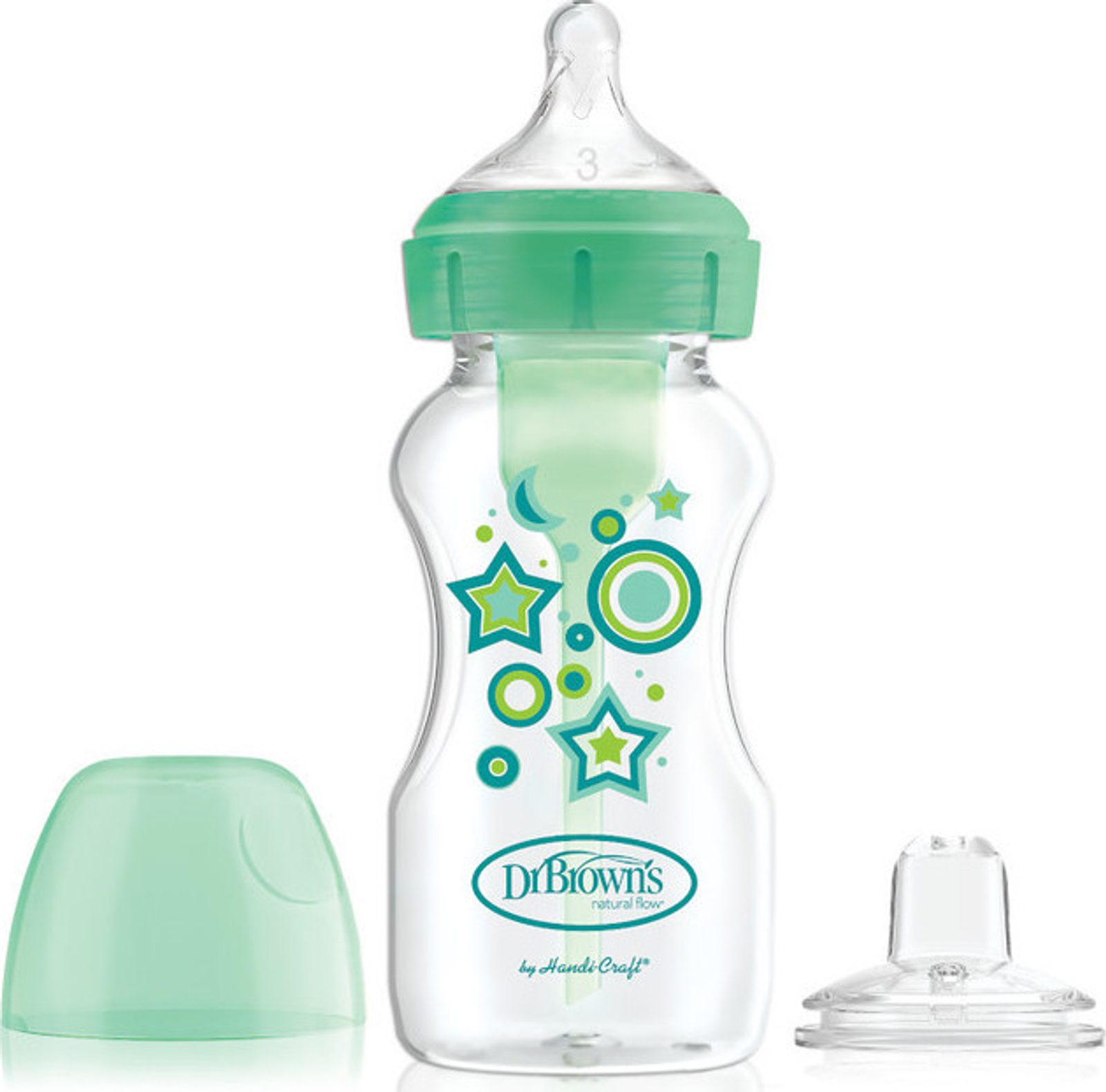 Láhev je vybavena dudlíkem úrovně 3 a navíc měkkým silikonovým nevylévajícím náustkem. Když je vaše dítě připraveno, vyjměte vnitřní ventilační systém z láhve a nahraďte savičku náustkem, který připraví vaše dítě na pití z hrnečku.