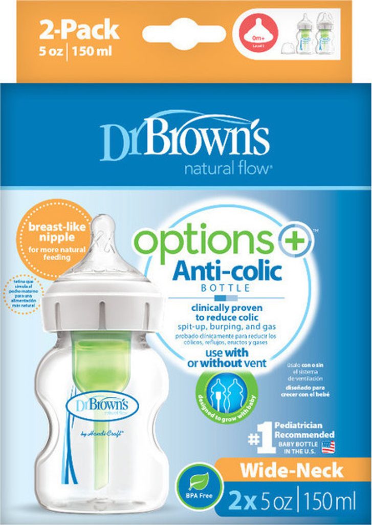 Nejnovější láhve Dr Brown's Options + dávají rodičům možnost vybrat si, jak chtějí své dítě krmit. Patentovaný ventilační systém vám umožňuje krmit vaše dítě lahvičkou Dr. Browna s ventilačním systémem nebo bez něj. Láhev má nový tvar savičky, připomínající matčin prs.