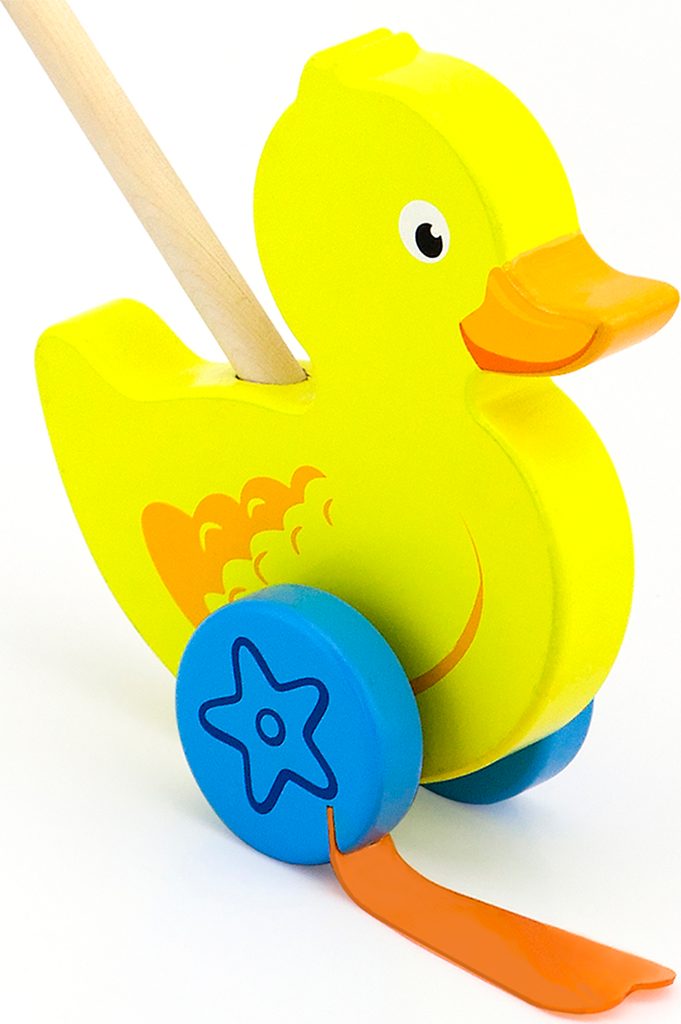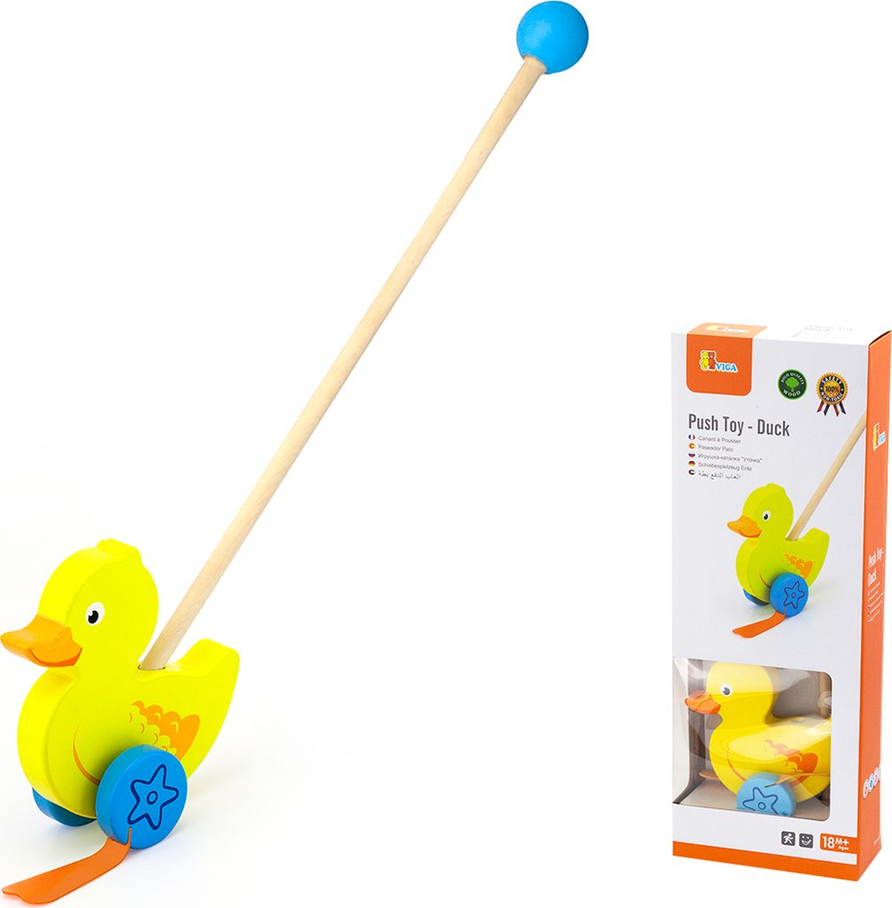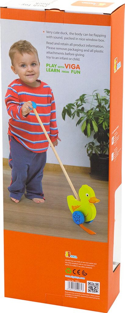 Dřevěná hračka na tyči Viga kačenka je skvělou alternativou tahacích hraček pro děti. Perfektní edukační hračka. Ideální na společné procházky a hraní doma. Gumové prvky připojené na kola vtipným způsobem napodobují chůzi zvířat. Hračka pomáhá zlepšit manuální zručnost a obratnost, učí dítě rozpoznat tvary a barvy, zapojuje a rozvíjí smysl pro pozorování. Hračka je vyrobena z lakovaného dřeva. Naší prioritou je bezpečnost a kvalita našich výrobků, a proto barvy použité na hračkách nejsou toxické a splňují bezpečnostní standardy (EN71 a ASTM). Rozměry hračky: dxvxš 15x8,3x5,6 cm. Určeno pro děti od 2 let.