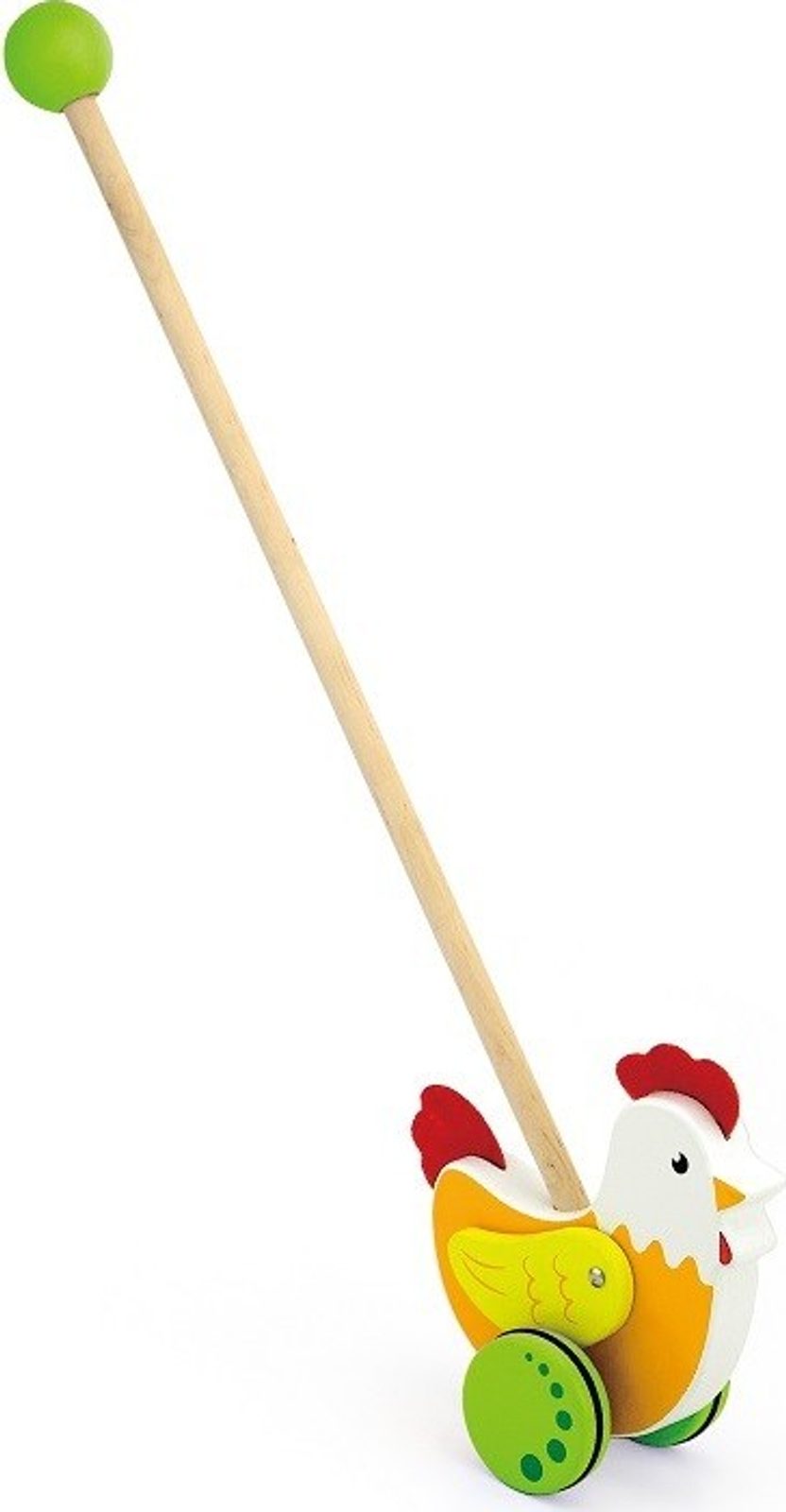 Dřevěná hračka na tyči Viga slepička je skvělou alternativou tahacích hraček pro děti. Perfektní edukační hračka. Ideální na společné procházky a hraní doma. Gumové prvky připojené na kola vtipným způsobem napodobují chůzi zvířat. Hračka pomáhá zlepšit manuální zručnost a obratnost, učí dítě rozpoznat tvary a barvy, zapojuje a rozvíjí smysl pro pozorování. Hračka je vyrobena z lakovaného dřeva. Naší prioritou je bezpečnost a kvalita našich výrobků, a proto barvy použité na hračkách nejsou toxické a splňují bezpečnostní standardy (EN71 a ASTM). Rozměry hračky: dxvxš 15x8,3x5,6 cm. Určeno pro děti od 2 let.
