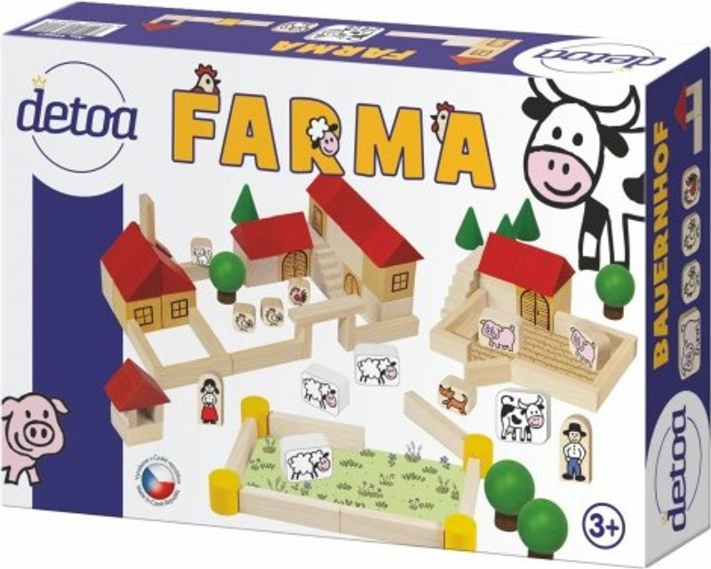 Děti budou milovat senzační farmu, kde je toho hodně k vidění a samozřejmě ke hraní. Složí si za pomoci hracích desek a dřevěných dílků domek, stodolu, ohrady. Vše je doplněné kostičkami farmáře, jeho ženy, traktoru a samozřejmě nechybí zvířátka. Balení obsahuje celkem 100 dřevěných dílků.