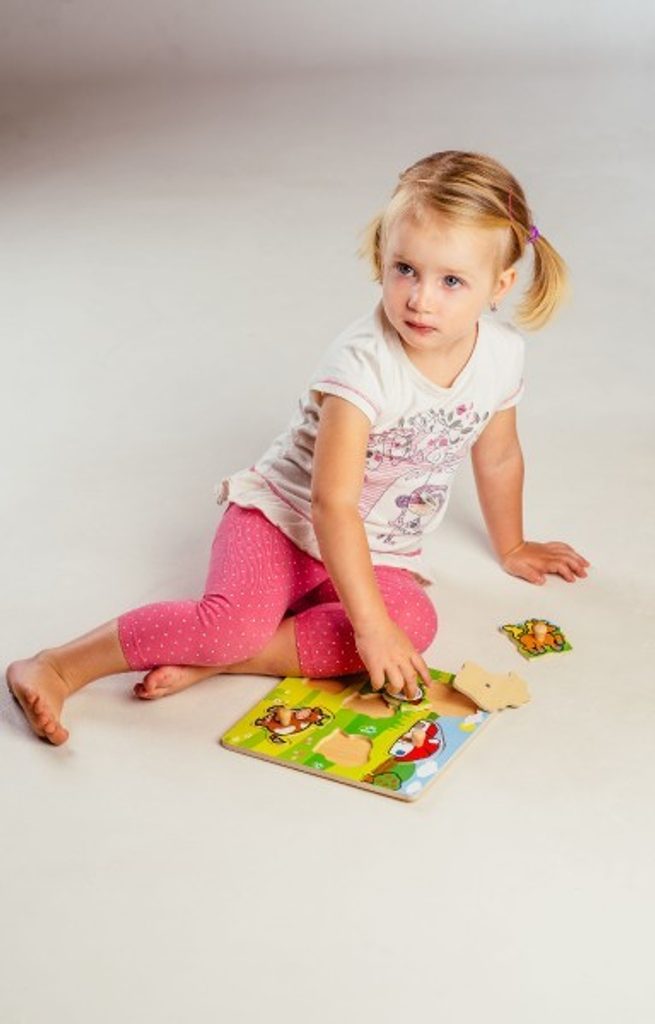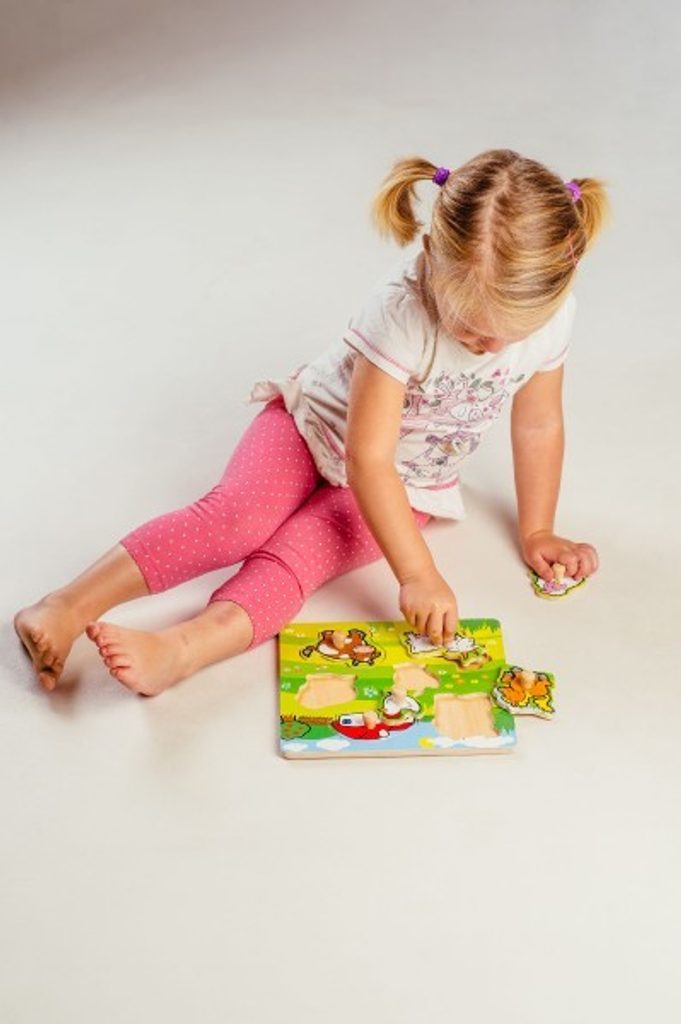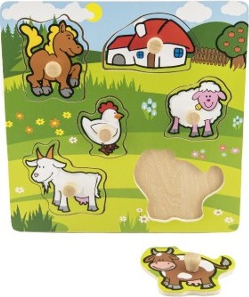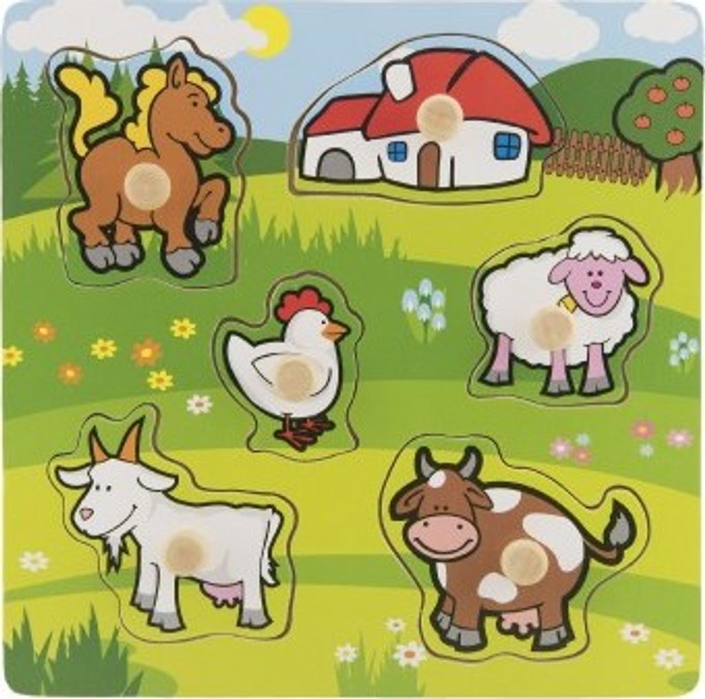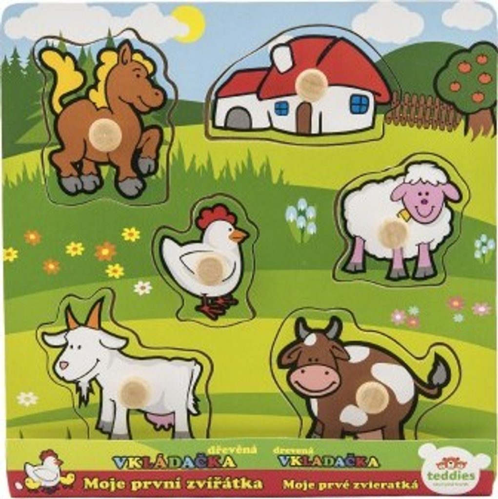 Dřevěné puzzle pro nejmenší děti s obrázky veselá zvířátka na statku. Vkládací…