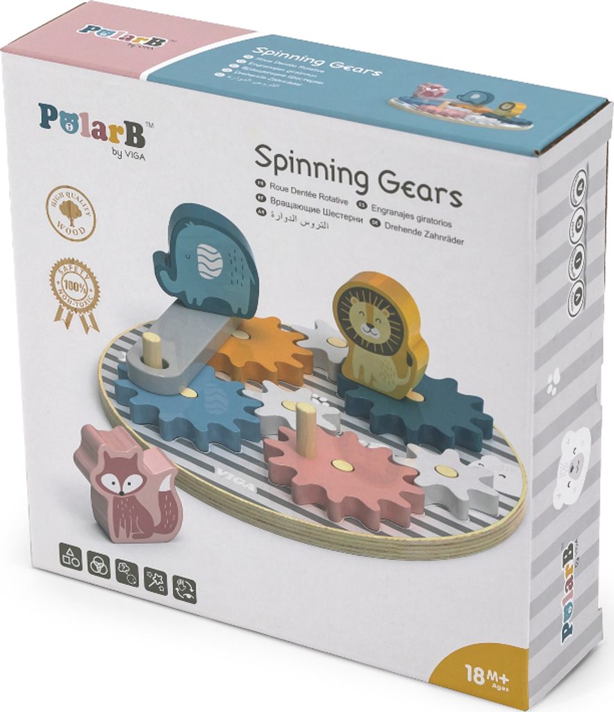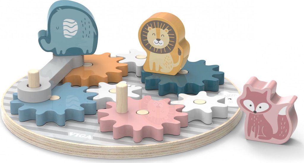 Dětská skládačka VIGA Ozubená kolečka a Zvířata je ideálním dárkem pro každé dítě. Vzdělávací skládačka se osvědčí jako pomůcka při rozvoji motorických schopností a koordinace ruka-oko u batolat. Kromě toho učí rozpoznávat barvy a tvary. 7 barevných dřevěných ozubených koleček, které se umístí na kulatou desku s kolíky. Při správném sestavení koleček uvede celou stavbu do pohybu pomoci otáčením kolíčků. Doplňkem je spojovací prvek a 3 barevná zvířátka (liška, lev a slon), která lze na ozubená kolečka umístit.