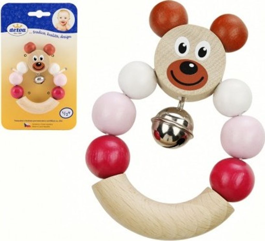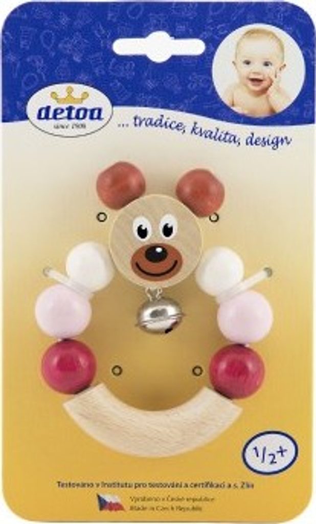 Chrastítko s medvídkem v růžové barvě. Rolnička jemně cinká. Chrastítko má nízkou hmotnost a je vhodné pro děti od 6ti měsíců. Výrobek splňuje požadavky EU na bezpečnost hraček. Rozměry výrobku jsou 70x90 mm a je připevněn na papírové kartě. Rozměry balení 10,5 x 17 x 2 cm.